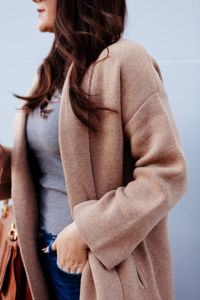 Camel sweater coat with grey turtleneck and cognac booties outfit on Kendi Everyday.