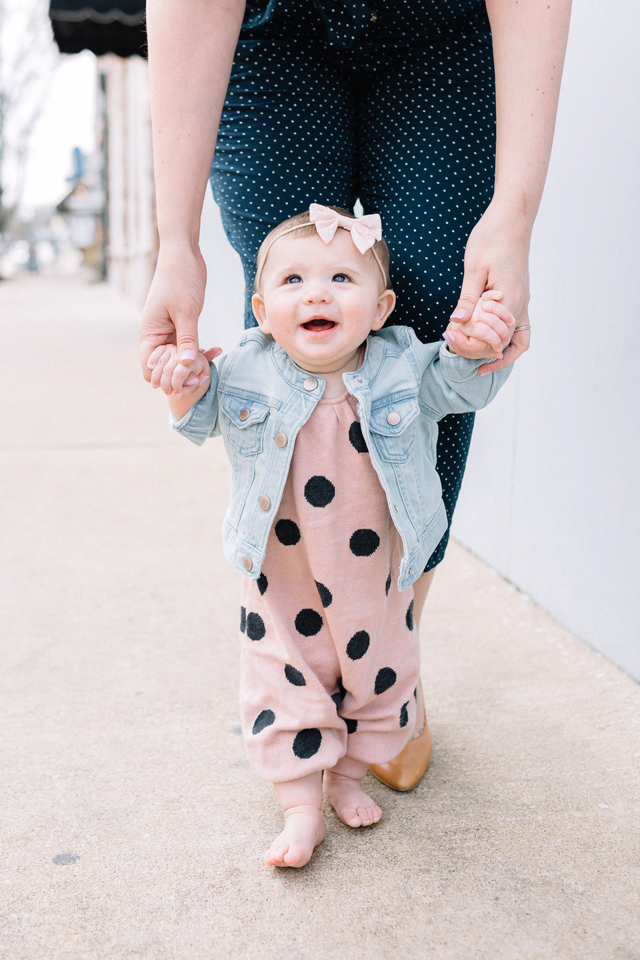 I love that Gemma is out of her pj’s all day stage. I don’t think everyone goes through this stage with babies but it just was a lot easier when she was little bitty to just keep in onesies. Naps were easier, diaper changes were easier, so onesies all day it was. But now putting little outfits on her every day is so much fun. The only thing she fights is the bow. And the shoes. But I’ve got a feeling that one day she’ll come to love accessories. We will get there.