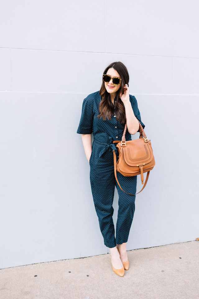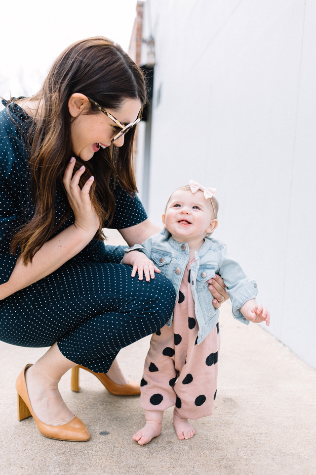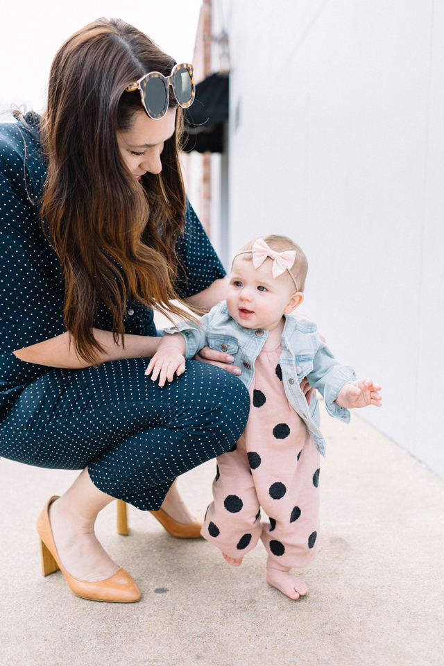 I found this La Vie Rebecca Taylor jumpsuit and it was a no-brainer. I love Rebecca Taylor in general and for some reason, I’ve been really into jumpsuits/ rompers/overalls lately. I go back to the fact that it’s because I don’t have a baby bump saying ‘you can’t wear that.’ (Although now that cute little bump can wear her own little romper, too. And that’s even better.) I just feel like a polka dot jumpsuit screams Kendi. And now it screams Gemma too. I actually found her knit jumper at Zara. And I found her denim jacket at Old Navy. (Here is one with a collar, if you are a purist.) I’ve linked a few other rompers to the right of this post!