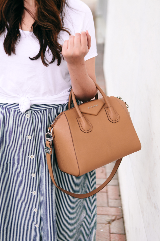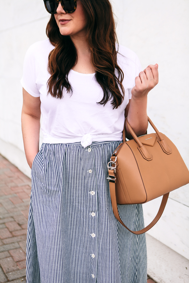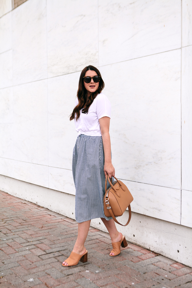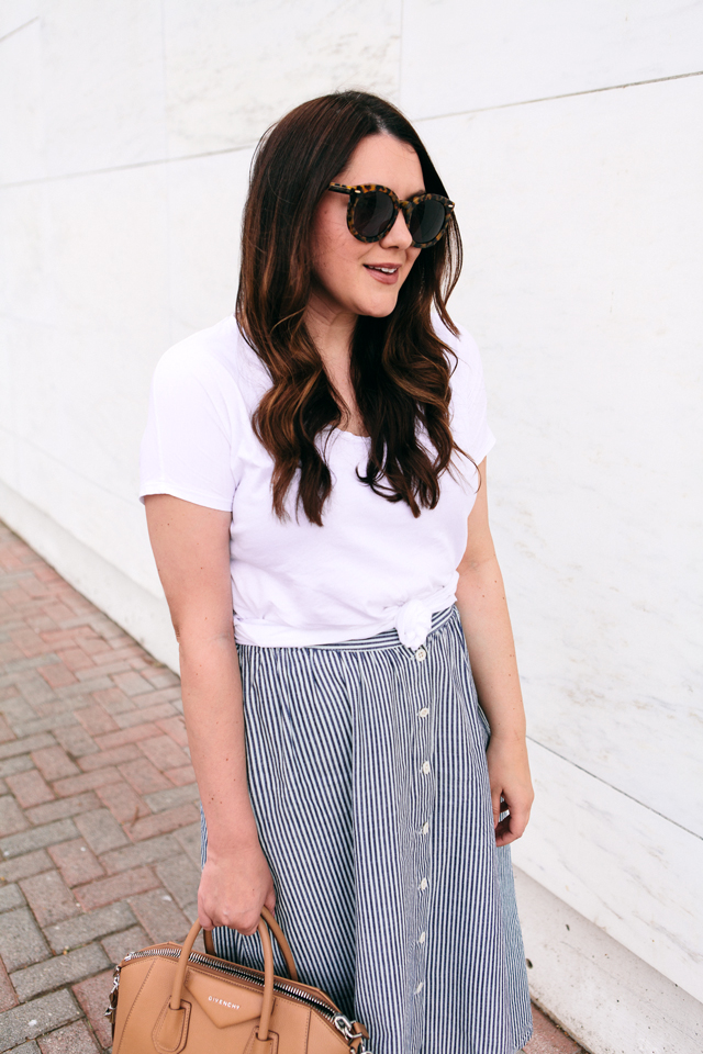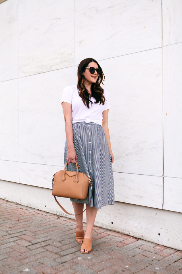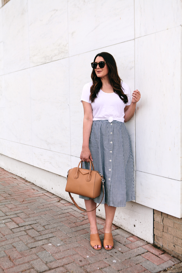 Not even joking, I was just going through some of my old spring/summer pins on Pinterest *last night* and came across one of your outfits with a blue striped top (knotted at the waist) and white midi skirt. It’s still one of my favorite outfits! Imagine how excited I was when I saw you posted a new rendition of it!! (Also I bought this skirt in rust but kinda wishing I had also gotten the striped version, too, haha.)
