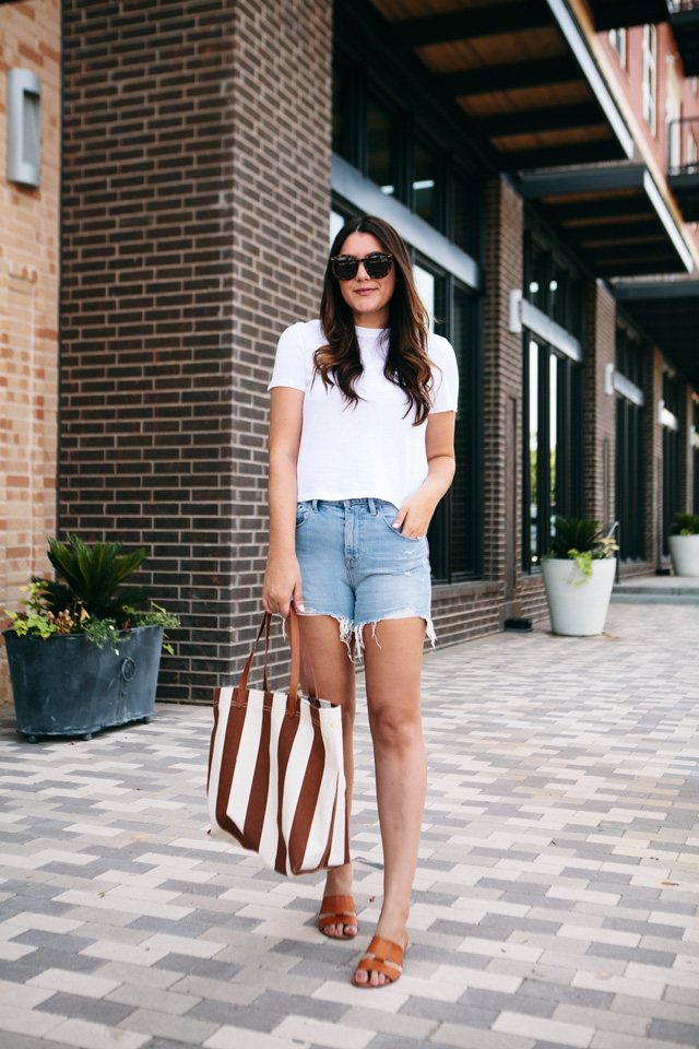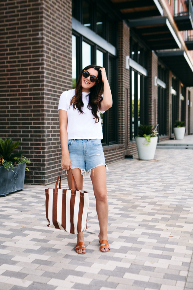 White tees aside, I feel like the real hero piece here is the striped canvas bag. I am loving this bag lately. I’d been wanting a canvas bag just to toss everything in, especially in the summer. I am just full relaxed in the summertime and I’ve loved Madewell’s totes for forever. (I had to retire my past leather one because it got so worn out!) This canvas tote is under $50 and super sturdy with leather handles. It’s the perfect companion for summer basics, like a pair of cut-offs and a tee. 😉