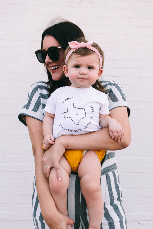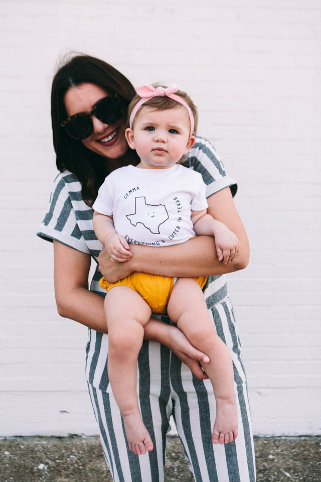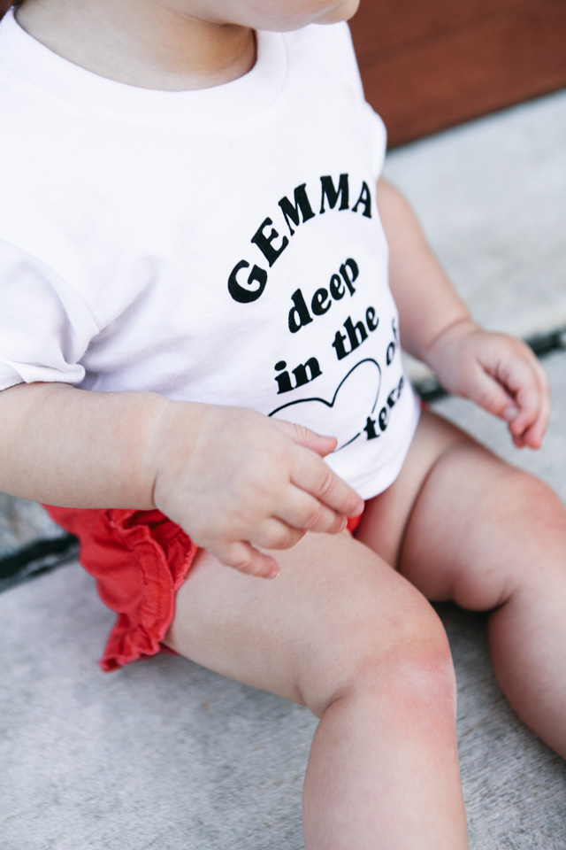 You can find these tees on Cheerily’s site and there are onesies for newborns and tees for babies to up to 6T! (Gemma is in the 6-12 month shirt and it fits a little big for 6 months, but as you know babies always grow. She is in about 12 month clothing and this tee fits just right for right now.) They are made with baby safe ink and organic cotton! And the best part?? You can get them customized for free! It’s included in the cost of the tee! So your tee for your little one obviously won’t say Gemma — unless your little one is also named Gemma. Then props to you for a cool kid name. 😉
