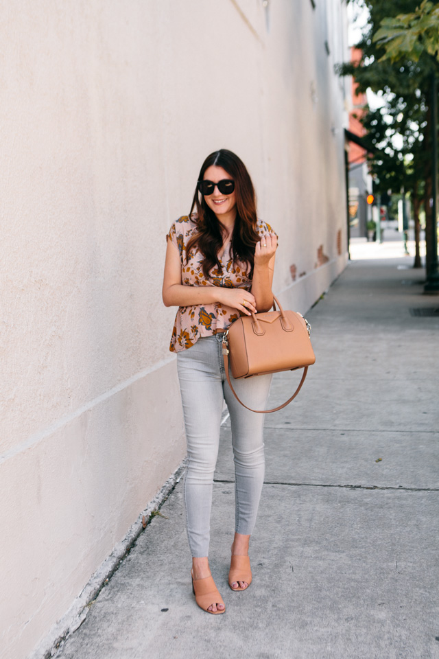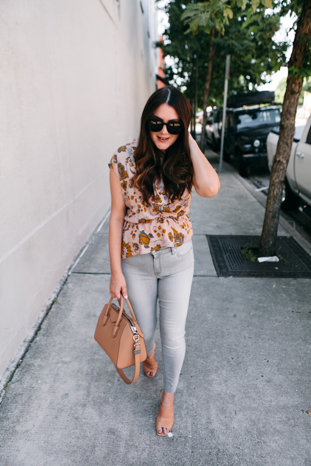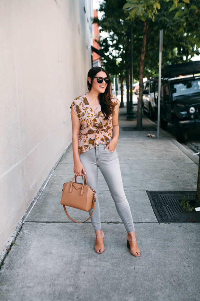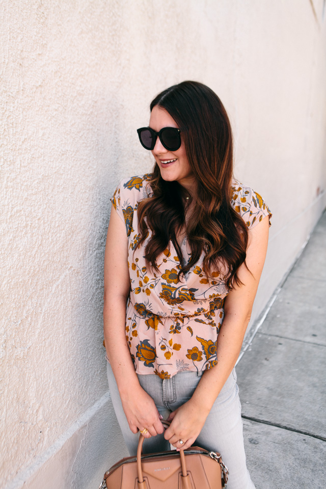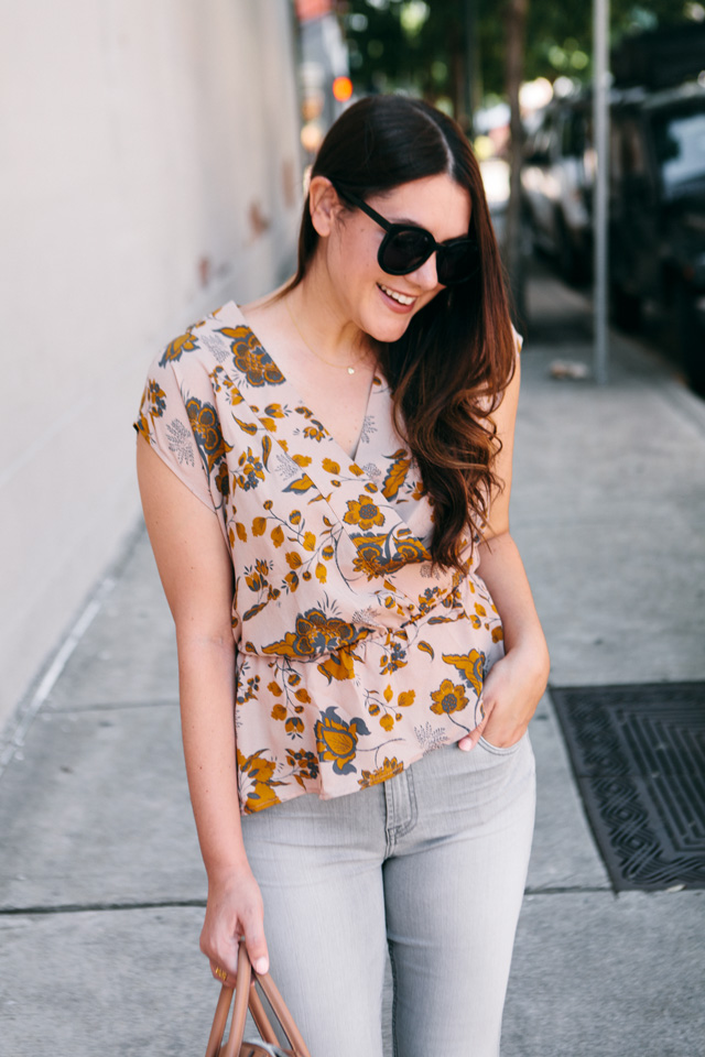 If you’re a nursing mama, this floral top is for you! It’s a wrap style and it’s literally so perfect for nursing. You can wear a camisole underneath but I didn’t have to, it didn’t come down too low for my comfort. It also doesn’t pop open in between. And as far as the color goes, it’s a tad bit darker in person than it is shown on the Nordstrom site but not as pink as it shot here. (We were across from a red wall, so the red highlights the shirt!) If you have any questions on fit or anything, let me know! I’ve put all of my fit info below in the Editor’s Notes.