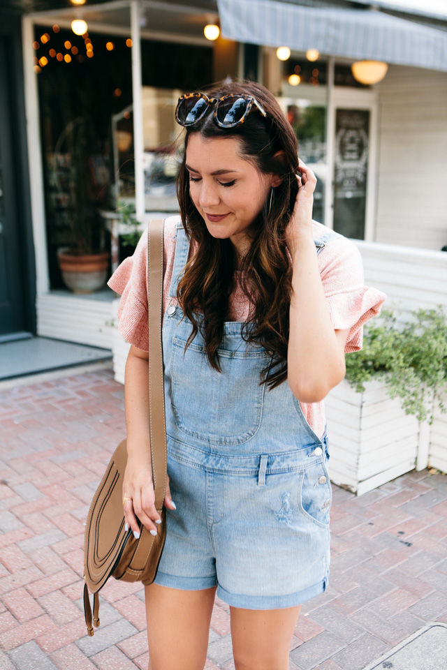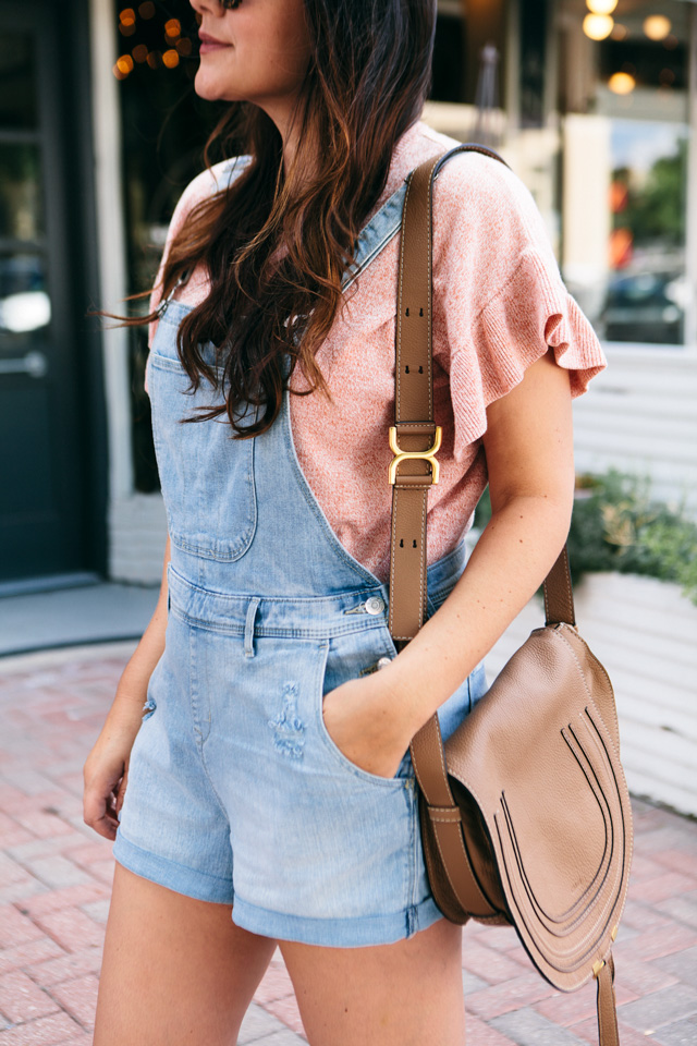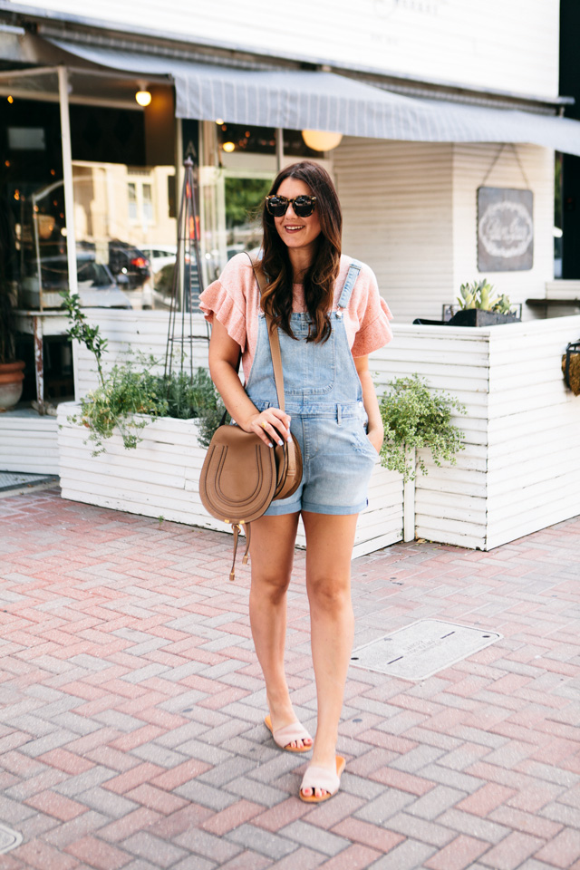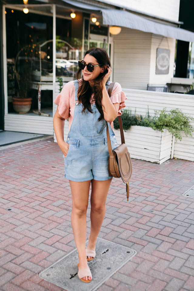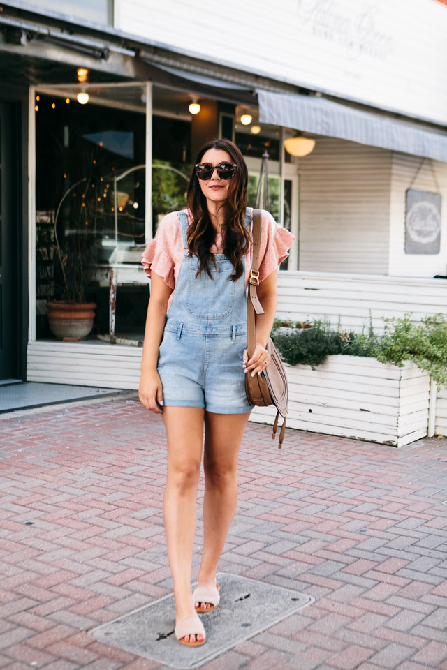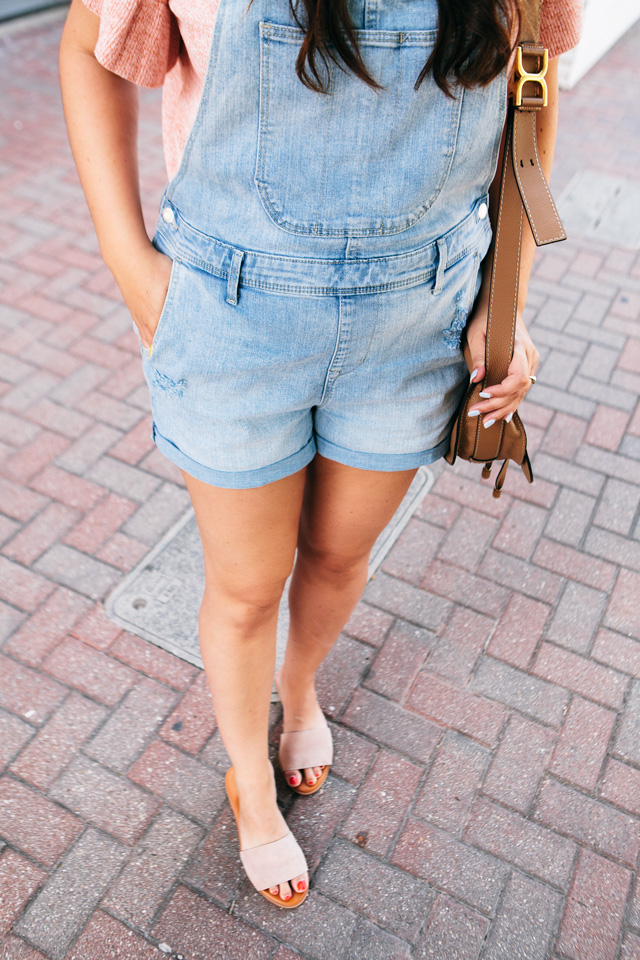 So I tried on this pair of shorteralls at Old Navy a few weeks ago on IG stories and you guys loved them! I had SO many questions about fit, where they were from, etc. Of course, if you remember, at the time, I’d tried them on over my yoga pants and sports bra because I had Gemma with me and our time is limited in a fitting room. Mama’s got to do what mama’s got to do. It was A LOOK for sure, but I will say this outfit with my ruffle sleeve Madewell sweater is 100% better. Although if you want to rock a short pair of overalls over a sports bra and yoga pants, then you do you, girl.