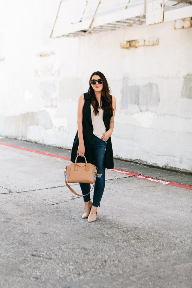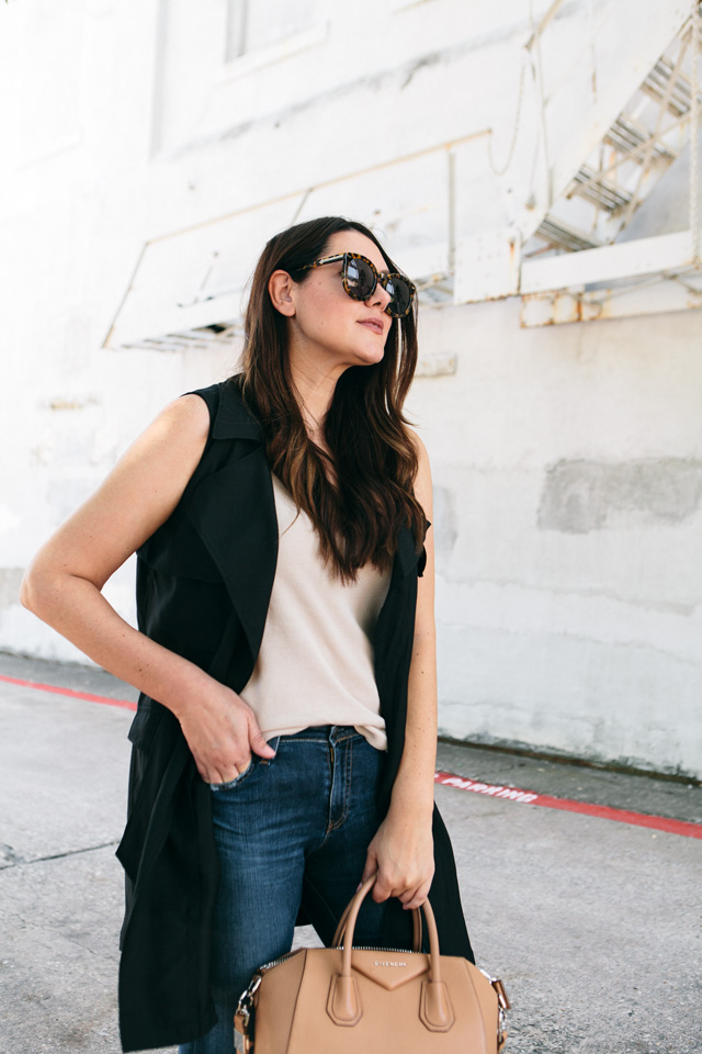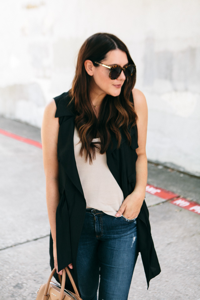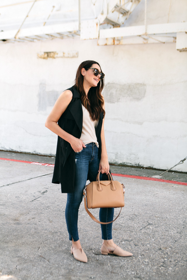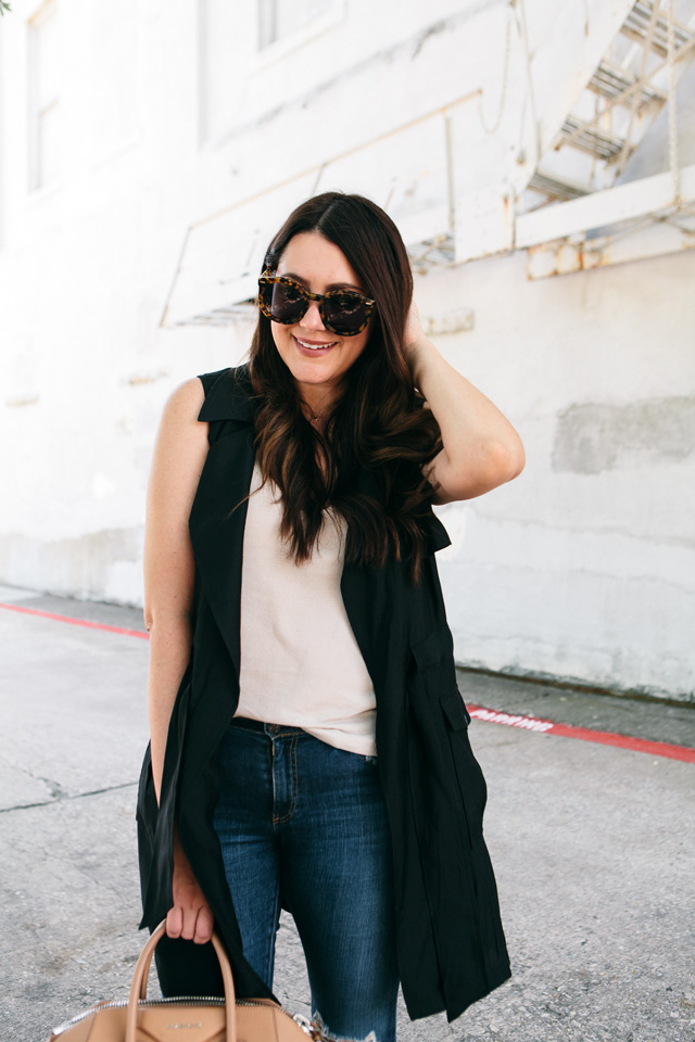 I didn’t actually pick this vest out on my own though. I got it from my Trunk Club trunk (I’ve talked about TC here and here!). It was one of two things that I kept because I just loved it but probably wouldn’t have reached for it myself. It’s nice when someone else can see a style you’d probably ignore. I feel like this vest will go well into autumn with longer sleeves but for now, this sweater tank works just perfectly. By the way, this sweater tank sold out but it’s now restocked in a few more sizes! I find that it runs a little small, so if you’re in between sizes, size up! And speaking of restocks, these ripped AG Legging jeans are back in stock as well! They sold out so quickly during the anniversary sale, but they are back!