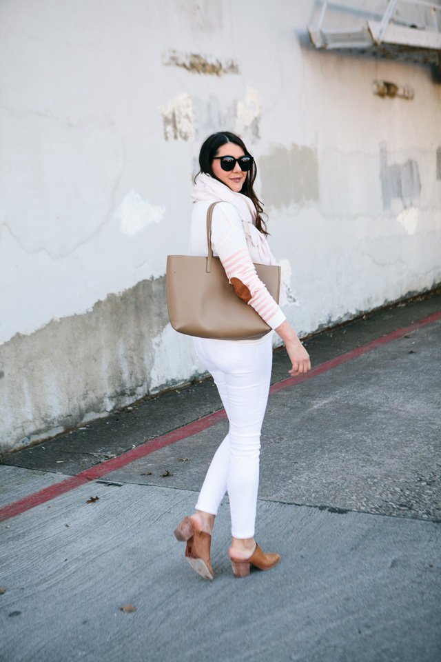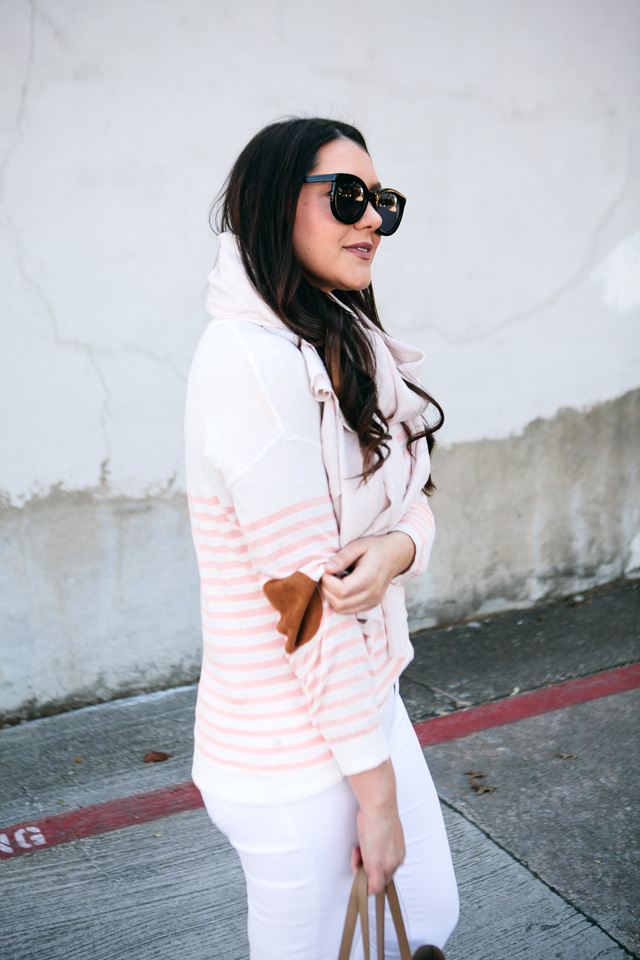 With March just a few days away, we are officially in the in-between. It’s not quite spring and winter has overstayed her welcome by a lot. I’ve had the door open for her to go for a few weeks now, even though that’s preemptive of me. But it’s been grey and dreary here for far too long and I need some sunshine. Since sunshine won’t come by way of the sky, I find myself finding brighter and lighter pieces in my closet to pull out. I’ve been loving white denim lately too which is weird for me. Granted, I love white denim but I’ve not reached for it as I have lately. The white jeans against the gloomy light out just make me feel a little bit brighter. Plus this sweater is a spring darling in the best way — how many ways could I pose up there so you could see the elbow patches? LOL. I hope you envision me saying to Bryan ‘Get the elbow patches’ to him over and over in a bossy way. 😉