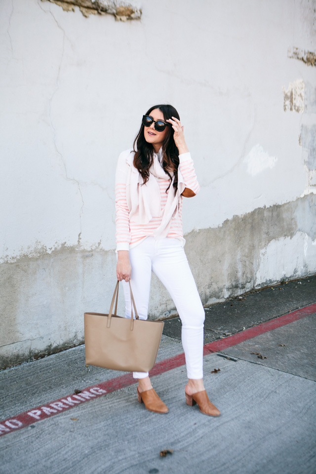 I like to start bringing in spring colors early, like this striped sweater in a pink-peach hue. I’m so drawn to light pinks and blues and lately lavender for spring, it’s an easy transition especially if you find these hues in sweaters or layering pieces. I am a true believer in spring sweaters that can work through the first few days of summer. So picking up a few light colored or bright colored sweaters for spring is a great idea that works through many seasons and many more months. Mixing them with white jeans? An even better idea. But working away from the greys, browns and blacks of winter can really help pick up your mood during these last days of grey.