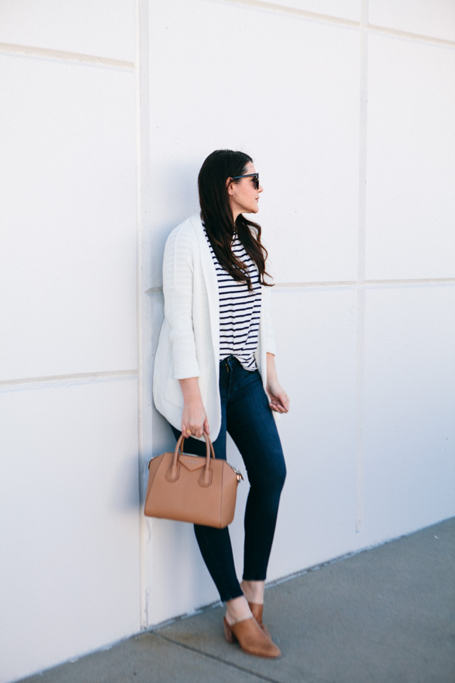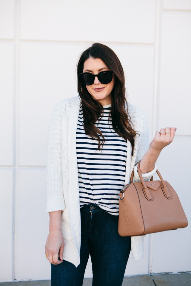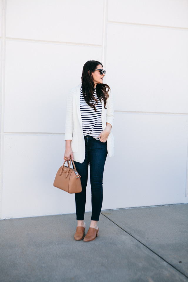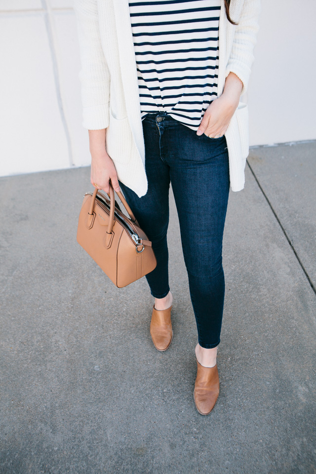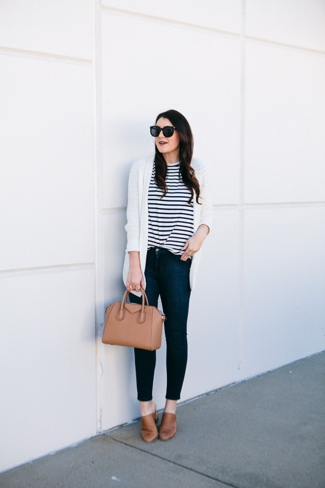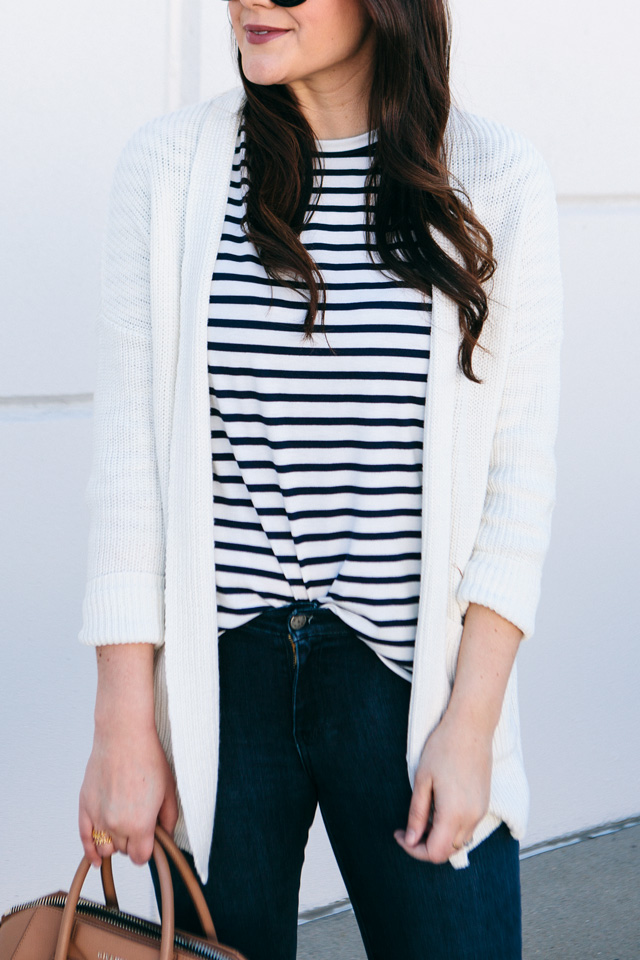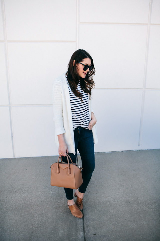I wanted so badly to shoot this gorgeous top today but it was 19 degrees when we got up today so there was NO way that shirt was going to make an appearance here. I love it so much but I’m hoping that the end of this week the sun will show and we can shoot this perfect spring top. Since I couldn’t do what I wanted to, I decided on the ever giving classic pieces I have + this new striped tee! This white knit cardigan is still warm but fresh for spring. And paired with a classic tee it’s a no brainer, right? Which is good because right now I’m all sorts of clouded in my brain. I NEED no brainer outfits these days. How about you guys? We are having a heck of a time this spring getting ahead of the game. It’s been so dreary and cloudy and that 100% affects my mood which affects my motivation. Are you the same? We’ve FINALLY got sunshine today and honestly I can already feel my blood pumping a bit faster than normal. I’m hoping spring comes quickly because I am OVER the grey.
