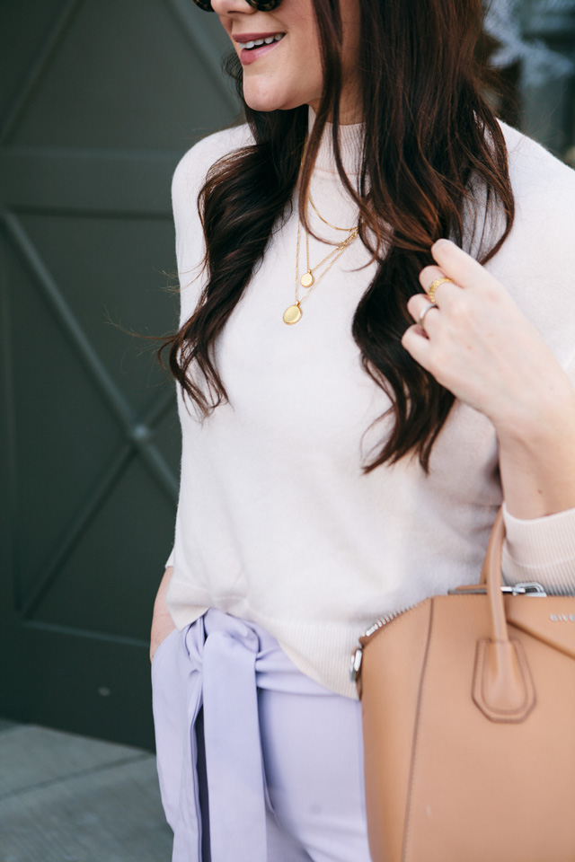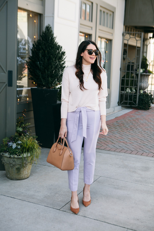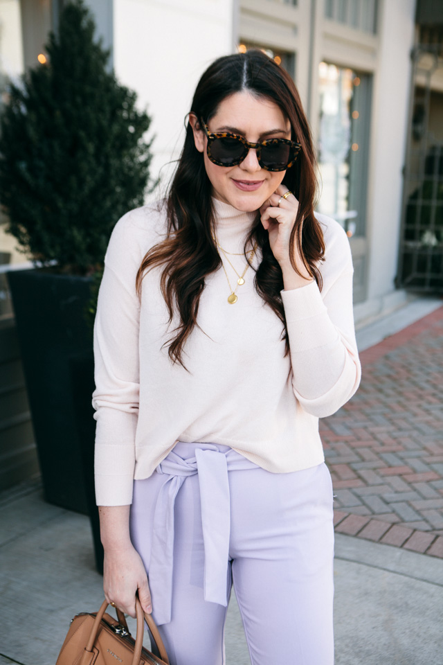 So I bought these lovely lavender pants a few weeks ago when Loft did a 40% off sale and guess what? They are 40% off again — like right now! I’ve not worn them yet because it’s been stupid cold here and to me, they scream “spring!” They have literally been sitting in my Loft bag in my closet because I’m a garbage person at heart and I had not hung them up yet. I’ve been waiting for warmer weather to pair them with some spring tops but I just couldn’t wait any longer. I was a little sad to be putting a sweater on but I figured this light pink Everlane sweater is spring enough right? (This sweater is a favorite from last winter! It’s light enough for spring, though. I would say it’s more of a spring weight than winter.)