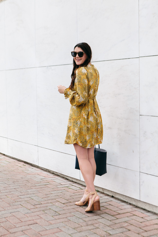If you are wondering why this dress looks a bit different than online, it’s because I used a little style trick of mine! I wanted this dress to have more of a fitted silhouette, which is quite the opposite of it’s flowy, shift dress nature. This dress is your typical Loft style dress — flowy, shift dress with a fabric tie. Sometimes I feel like dresses like this are one-trick ponies; which made me think — how can I change this dress up? While I do love a shift dress and a loose one at that, I wanted this to fit a bit tighter. Want to know the trick? I simply tied the waist tie in the back, pulling it tightly to create a flattering waistline. (See below!) Boom a different silhouette from a simple dress. It changes up the whole look, honestly!