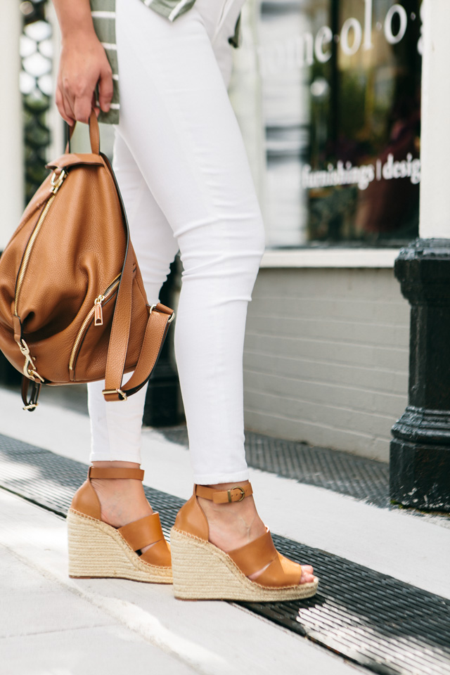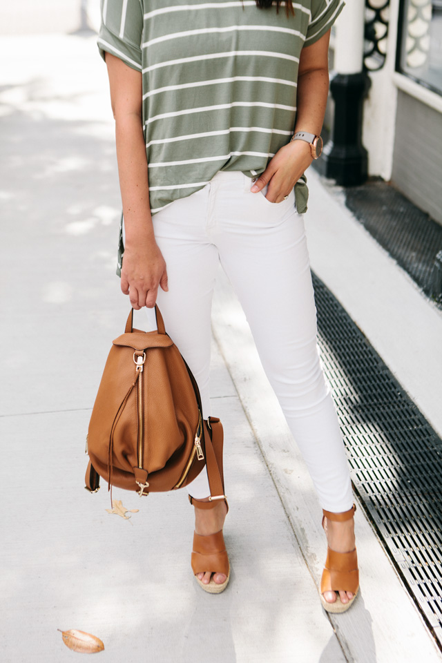 How much do we love stripes and white denim together? I mean honestly. If this pair wasn’t mean to be together forever, then I know nothing. I love this light olive for spring / summer. I used to categorize color by season but I’m loving the cross-seasonal colors lately. Olive I typically go for fall but spring popped up with this light olive, almost sage and boom now my mind is completely changed. My tee is from the shop and is under $25! It’s super soft (like pajama soft) and it fits true to size. It’s more of a boyfriend fit, but is true to size. You can find it here!