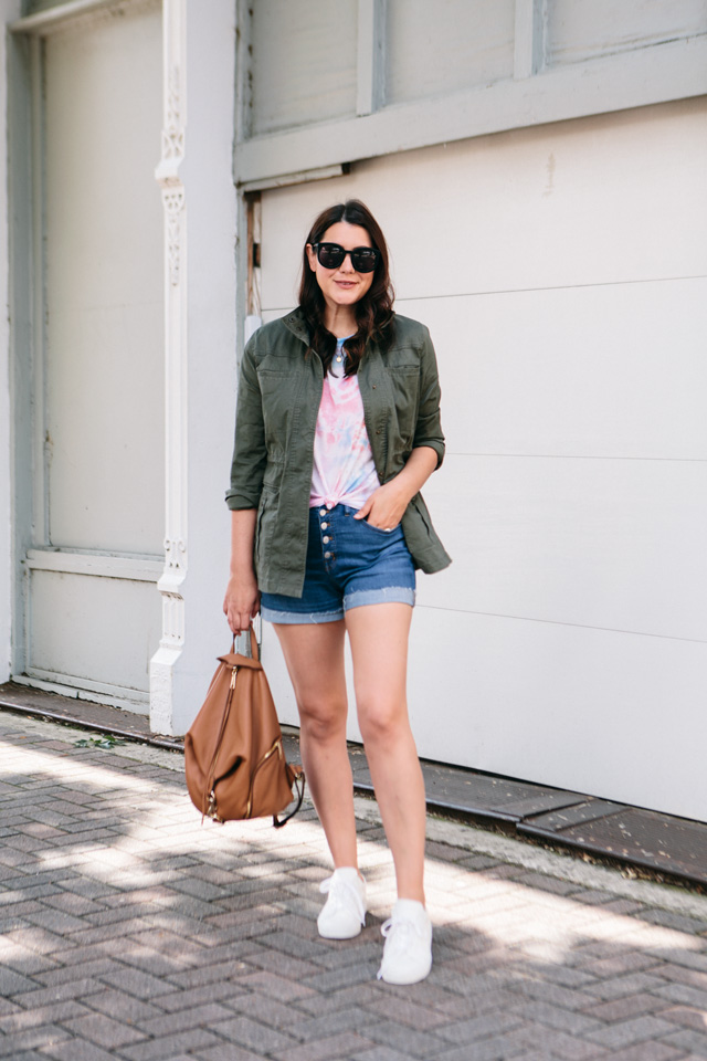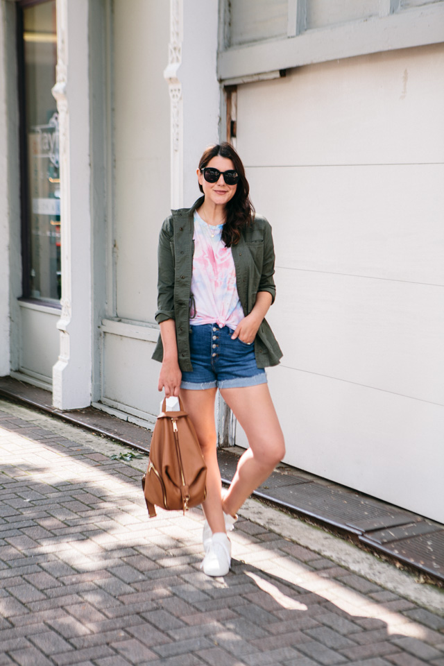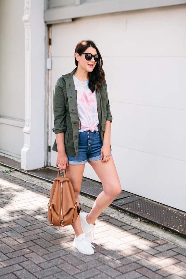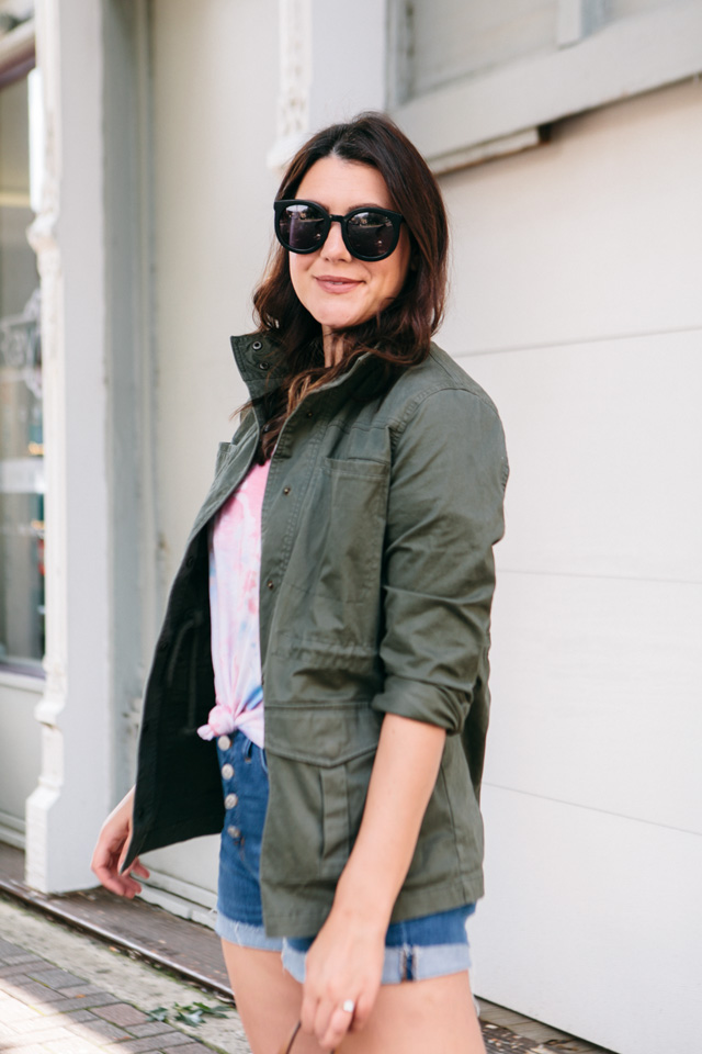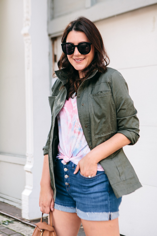 Would it even be summer and would I be a blogger if I wasn’t in denim shorts? That answer is nope, it’s actually a requirement for us all. I think the easiest way to wear this bold trend is to dress casually but with a little twist. Denim shorts are a no-brainer in a good way if in doubt go denim (and if hot, go shorts). But with the tee alone, I felt too casual. Throwing on a structured jacket brings this trend to an elevated level and a bit unexpected. I love this utility jacket I picked up from Target for our trip to New York last month, I’ve been wearing it non-stop ever since. (If you wonder why I wear jackets in warmer weather, we have heat outside but inside is always freezing because of the A/C. So summer months I usually always have a jacket or cardigan on hand for the back and forth temperatures.)