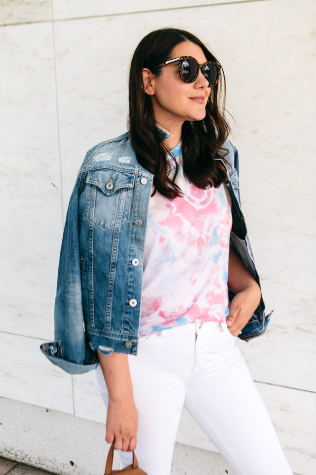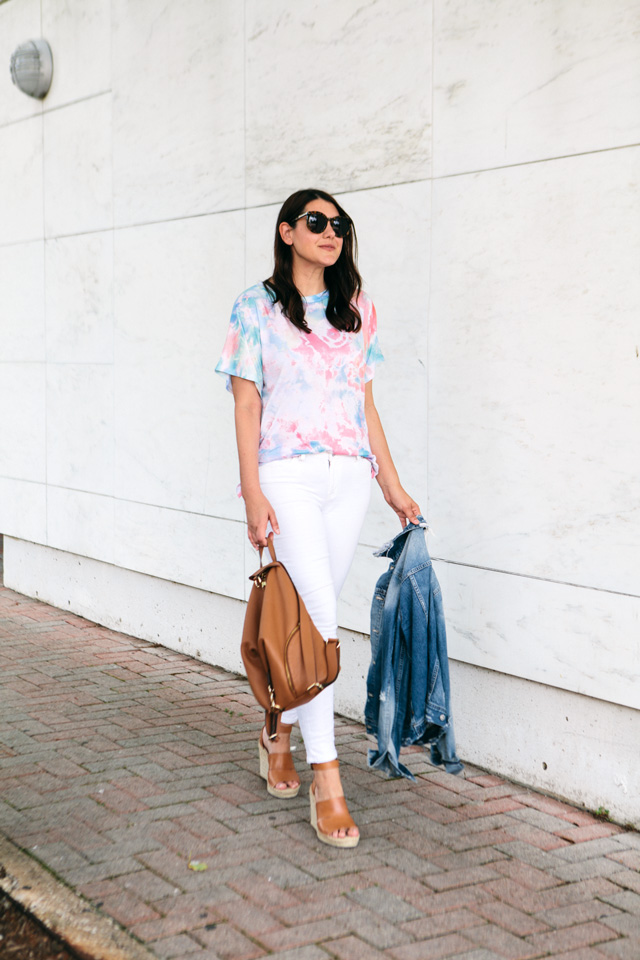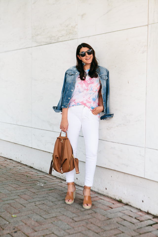 White jeans were obviously my first choice — if you need a classic look, go with white denim. That’s just the rule in the summer: when in doubt, wear white. I was pleasantly surprised as to how much this dressed up this very casual tee. A little wedge action and neutral leather accessory really bring the outfit together. Plus I wanted to add to the blues in my top and a tossed on denim jacket does the trick to make this outfit come alive.