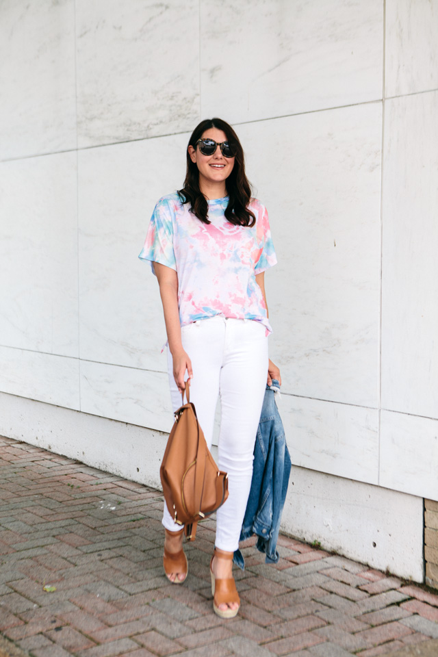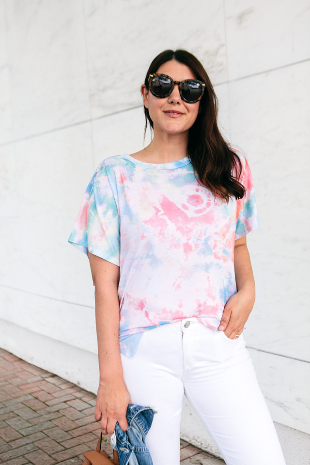 We ended up ordering a few tie-dye pieces for the store just to give the trend a nod and I’ve loved these pieces. This tee is from the shop and it’s super soft and has little flutter sleeves. It’s a nice balance of brights and pastels so that the trend doesn’t feel too in your face about it. It’s tie-dye 2.0; the grown-up version. I wanted to show you guys how to wear this trend two ways (honestly I wanted to wear it three ways but TRUE STORY my closet is a mess right now and I lost a denim skirt in there. I’m too afraid to go in to find it, so two outfits it is!)
