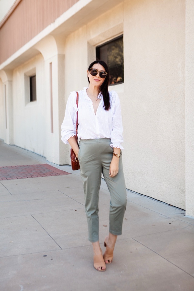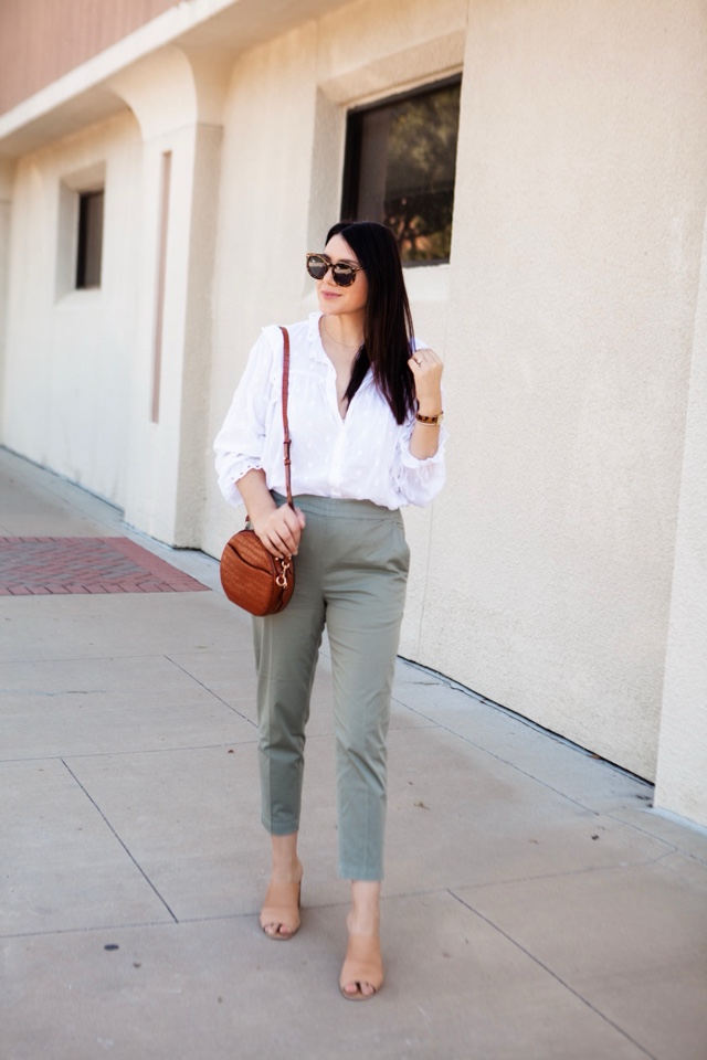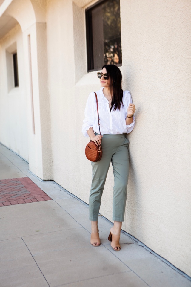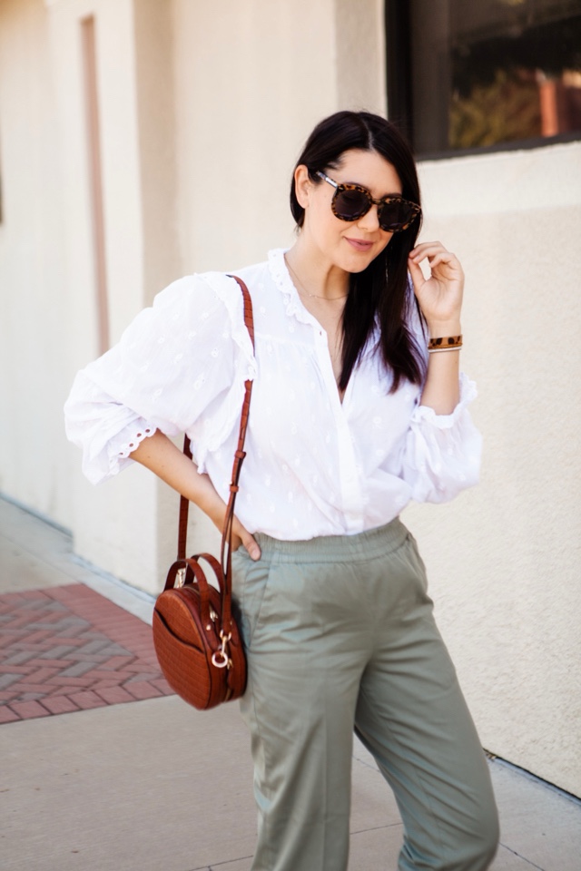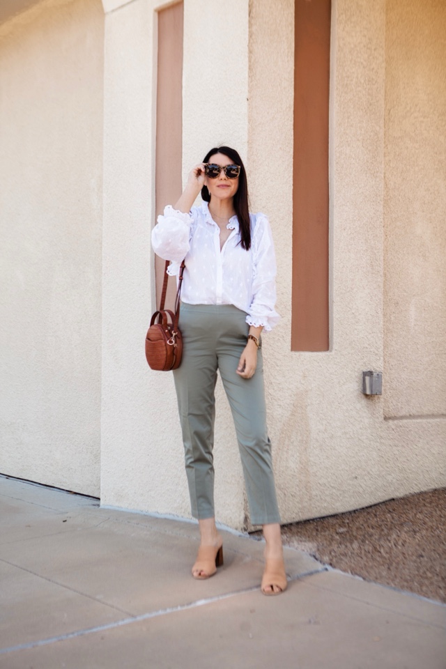 I paired it with this oversized eyelet blouse and honestly, I’m feeling kind of fancy for a Tuesday! I didn’t mean for that to happen but you know what? I don’t mind it at all. You can find my top here — size down one for a smaller fit. I’m in the 8 but would have preferred a 6.