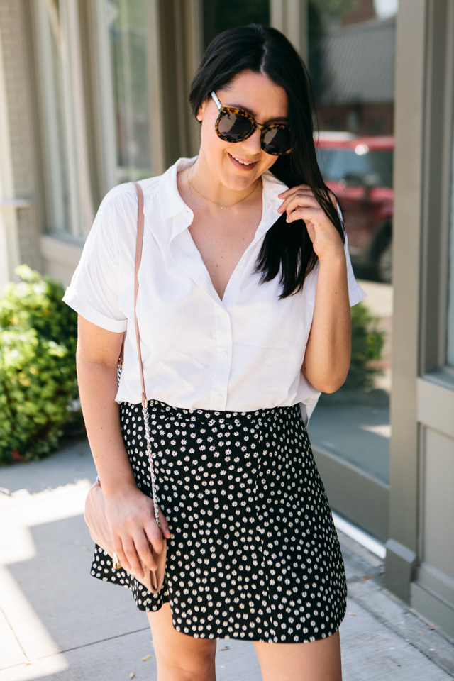 I love this floral maxi skirt and knew that a simple white blouse would pair perfectly with it — and boy was I right. I wanted to do a simple tie with this blouse to make this look a bit more casual and summery. Pairing it with the black accessories gives it a different look than the last time I wore this skirt, too!