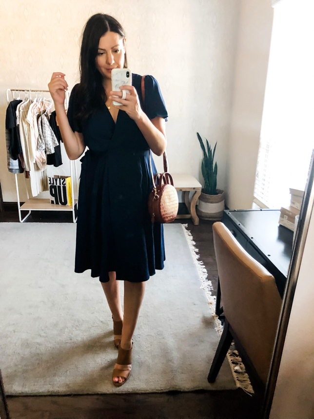 I can’t explain it but I just love this dress. It’s pretty simple — just a navy wrap dress — but I love the flutter sleeves and it fits my boobs! In fact, it’s a little bit loose on my boobs which is really an exciting thing for me, ha! I would say size down one if you are smaller up top. You may need to add a camisole underneath because the top does open a little bit but that’s not a deal breaker for me because it’s just so pretty. The skirt is flowy, the sleeves are the exact right length and it can work for basically any season. I am in the 8, my true to size. (PS this dress is nursing friendly!)