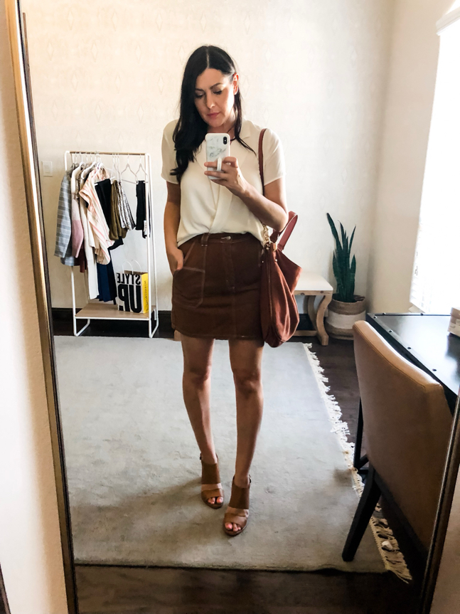 Vince Camuto Top / Topshop Skirt / Rebecca Minkoff Purse / Caslon Sandals
