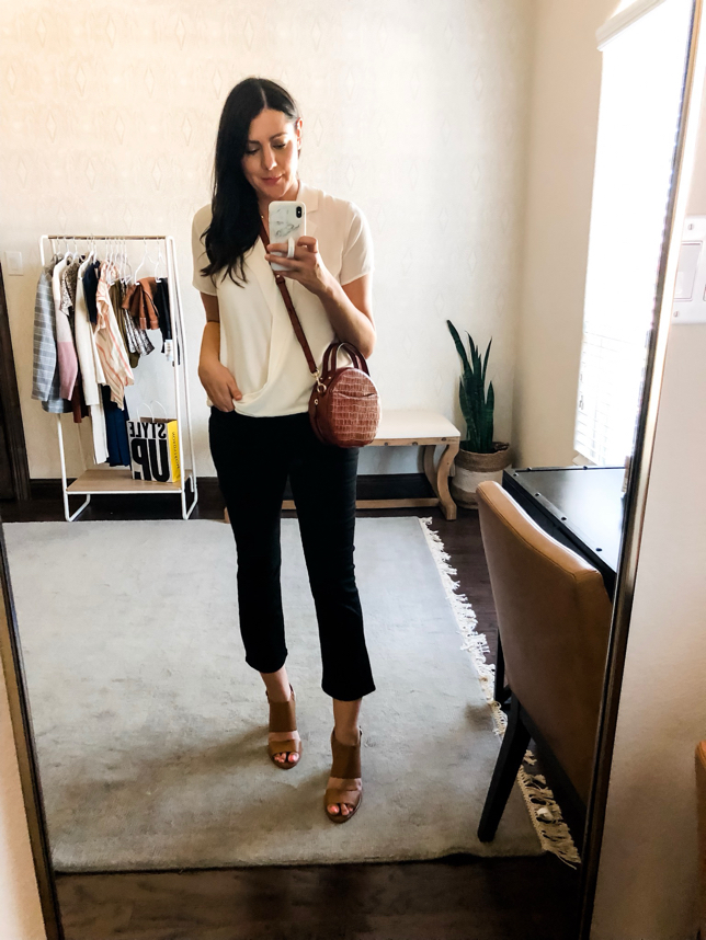 This is a wrap top from Vince Camuto that I thought would just be a nice basic. I was waiting for this top to come back in stock in my size but it never did, so I found this one and really like it! It’s not silk, but a crepe material so that may be a deal breaker for some. But it’s thick enough that it’s not see-through but it’s light enough to wear it now. There is a button to keep the top closed at the chest area which is nice. It comes in a few other colors, but I just love a classic white top. I am in the medium, I find it true to size! Size down if you are smaller on top! But if you have bigger boobs, this shirt works great! Nursing friendly too.