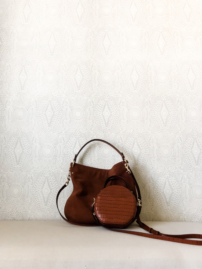Ya’ll. I LOVE this hobo suede bag. If you were looking for one bag to purchase, may I humbly suggest this one that I also have so we can be bag twins. I love it — it’s lined, it has an inside pocket, it fits everything perfectly and it comes with a strap to also be a crossbody. It’s just a nice bag and I love this kind of reddish hue. It feels different than other bags I have. Find this bag here!