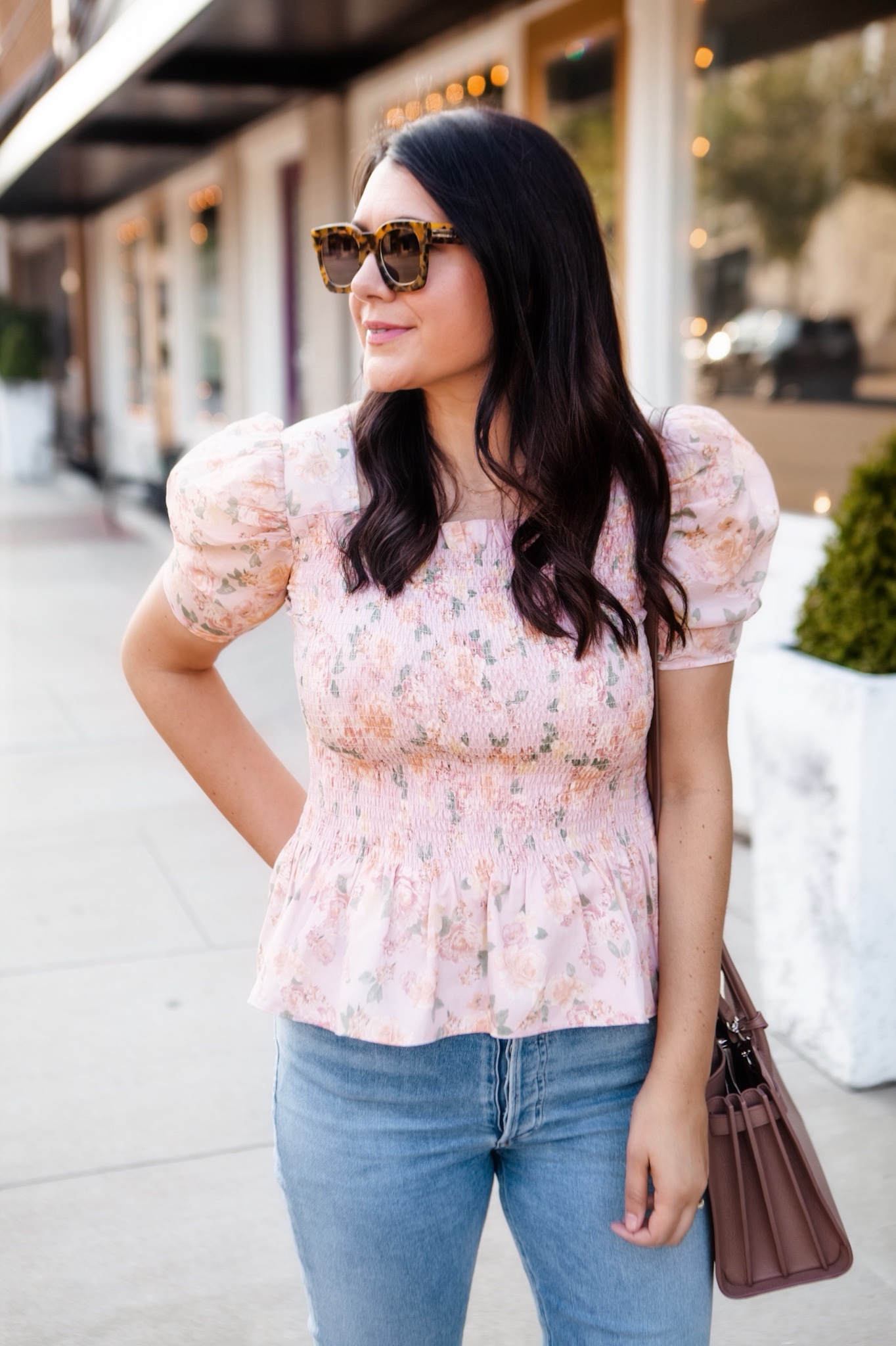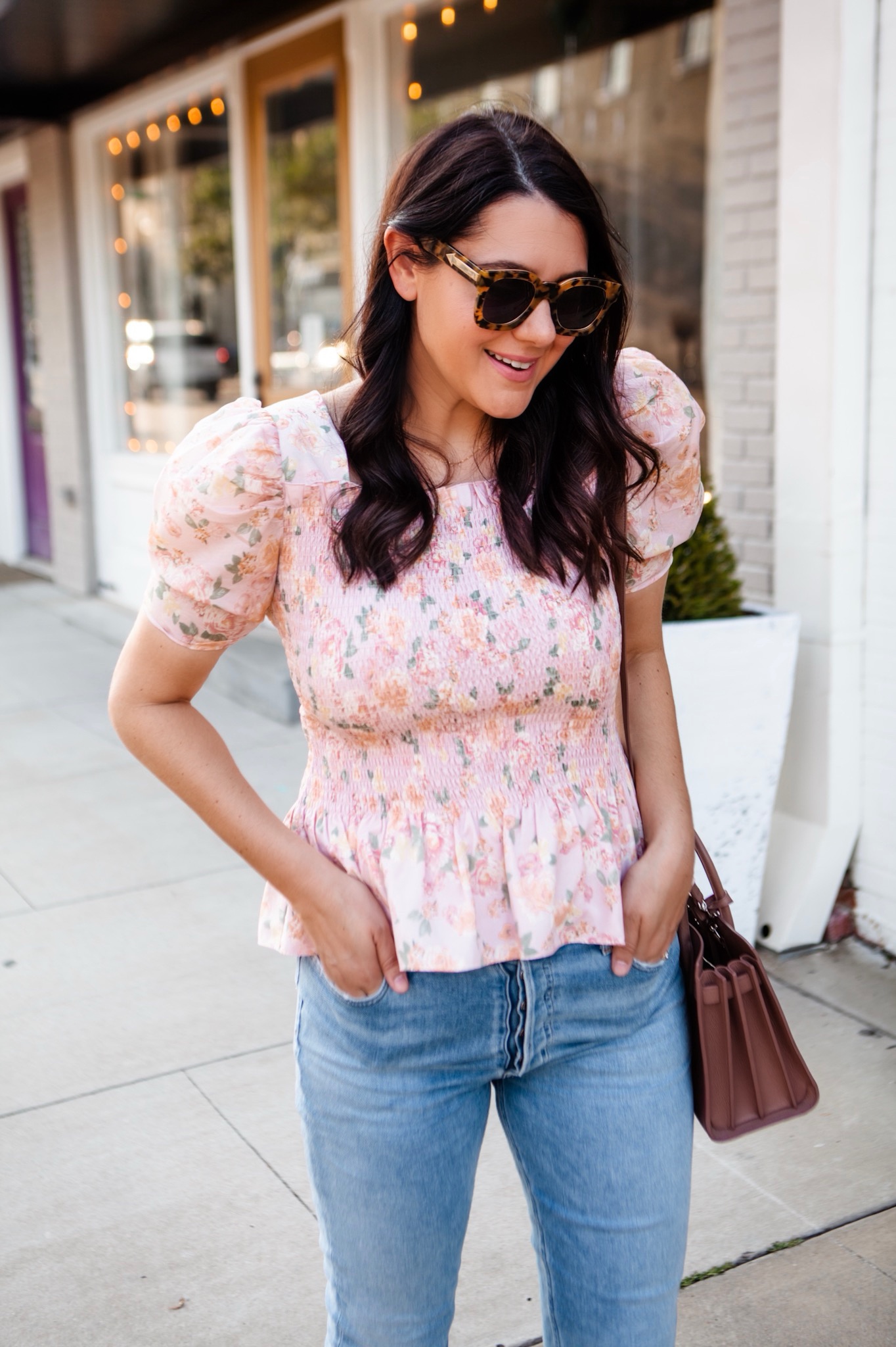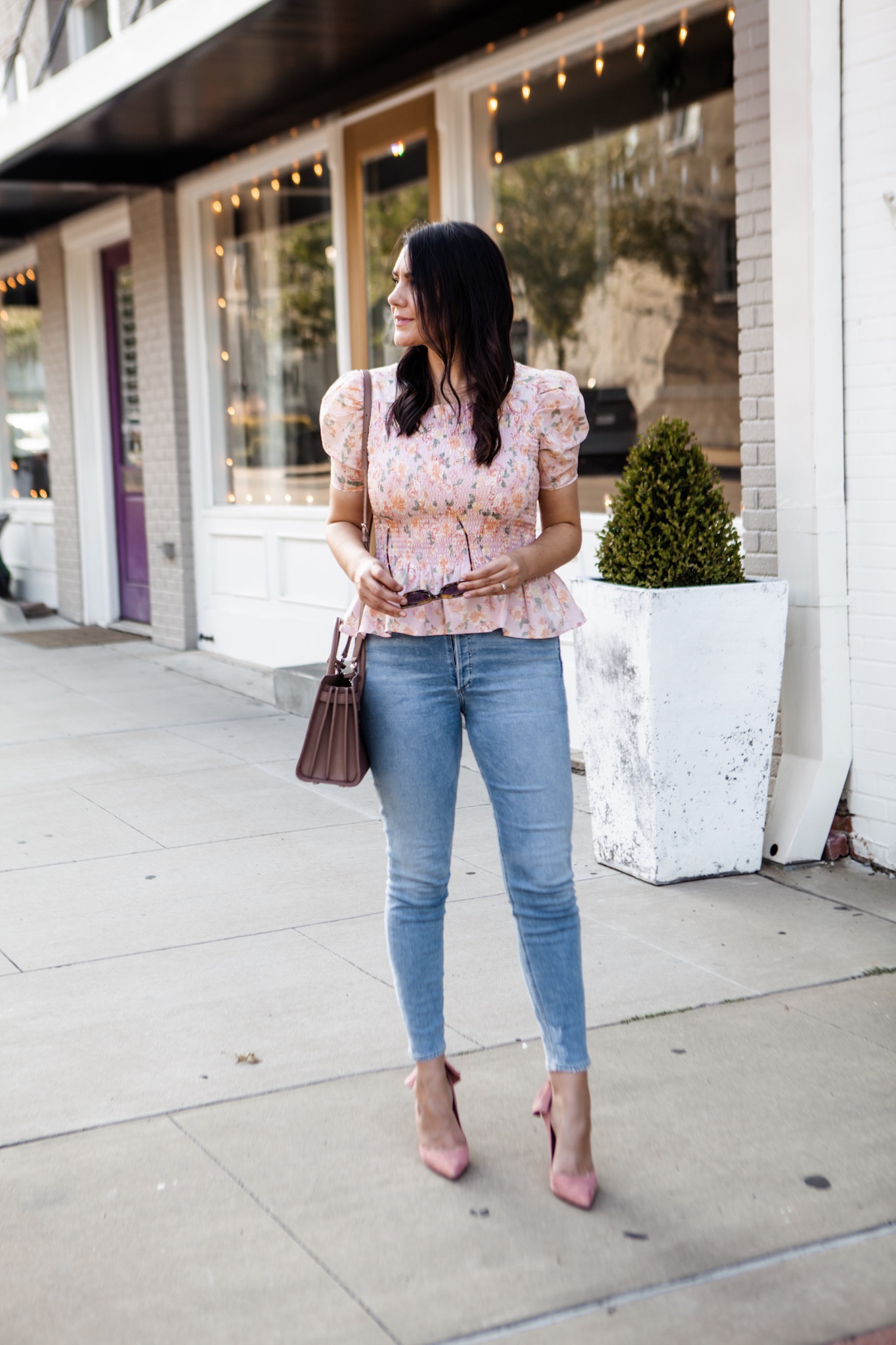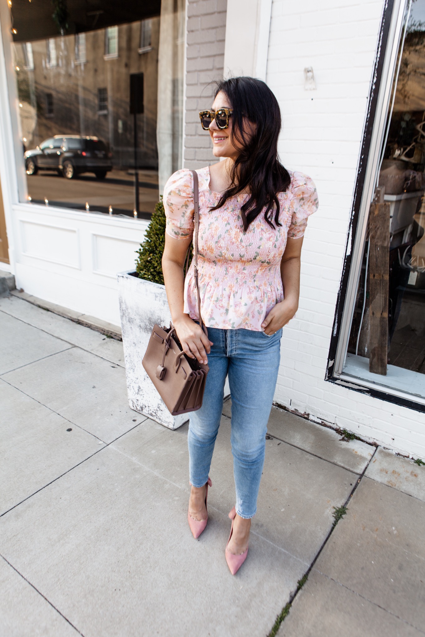 I thought I’d break out my outfit details here! Just in case you did skip that whole post above and are just looking for the ingredients! I am in the medium of the top and I was pleasantly surprised by the fit! I’ve not bought anything from Rachel Parcell’s Line and I really was impressed by the quality of this shirt and for the price! It does come in a few other colors, if you aren’t a pink floral kind of lady but you like the puff sleeves. I’m LOVING puff sleeves lately which can be a tricky trend but this shirt does the trend justice. You can find it here!