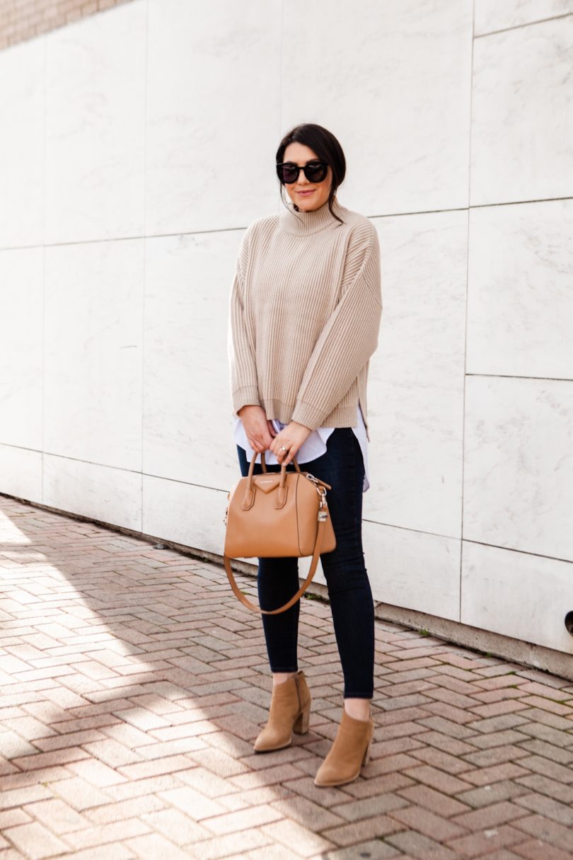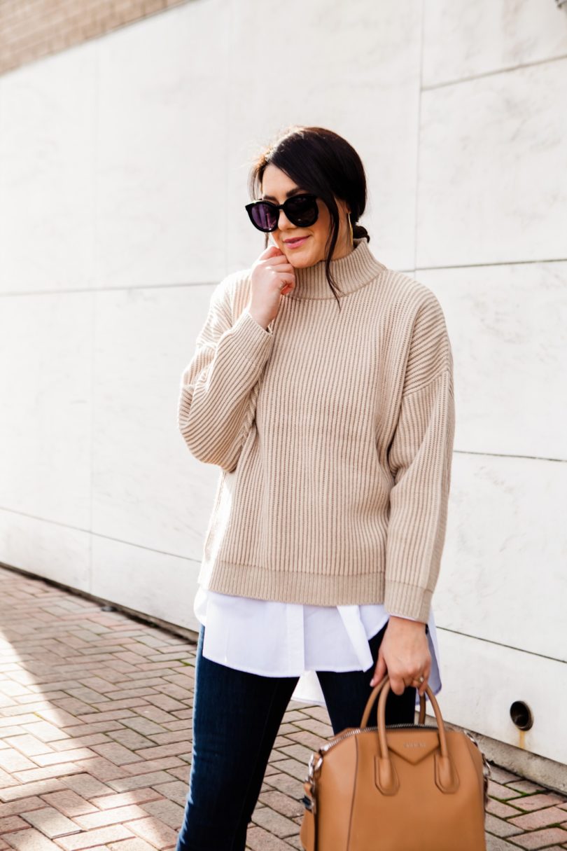 The absolute key in a stylish layered look is to have differentiations in your layered pieces. So here I have a longer button down shirt than I do sweater. If my sweater was just as long as this shirt — well. I mean. Let’s not even visualize this mess. So instead I am creating a visual interest with my layers, you can see my layers underneath and it looks effortless. I love the idea of high-low styling with sweaters and a layer underneath, especially with the rise of cropped sweaters around. As long as your under shirt is at least 4” longer, you will create a elongating effect that looks so chic. The same works with a turtleneck but in an opposite direction. You are creating a different proportion with a turtleneck under a v-neck sweater. The under layer doesn’t have to show but if it doesn’t, you want to be able to see each layer in some respect.