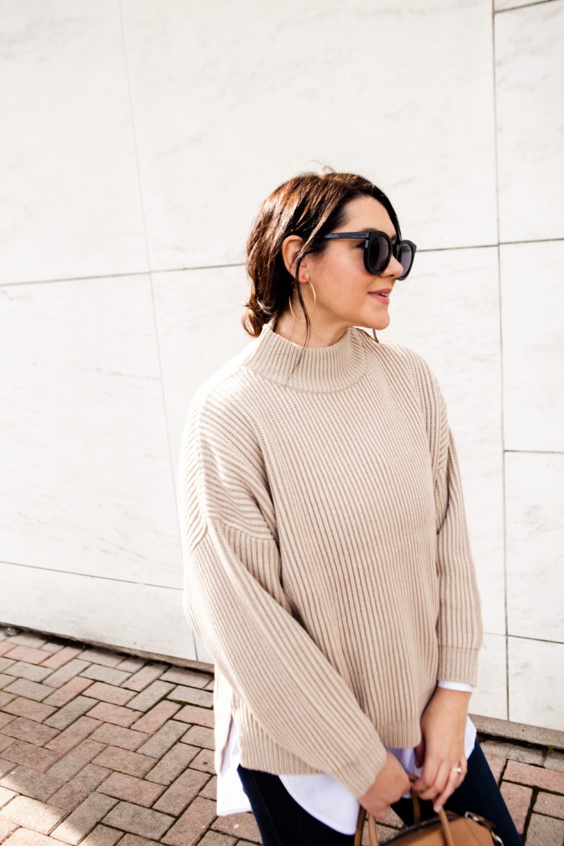 When you are ready for your main piece (i.e. my camel sweater above would be considered my main layer here), this piece needs to have some structure to it. By that, I simply mean that it can hold it’s shape over the bottom layer. The best way I can explain this is for you to think of the opposite of this — think of a cashmere sweater or a classic J.Crew sweater (both are linked for examples). These sweaters will absolutely not hold their shape against the lighter layer below, even if its just a t-shirt. They will cling to the layers and they will start to warp and take shape of the lower layers. (I think you know what I’m talking about — we’ve all worn this J.Crew sweater with a button down underneath and you could see every single button underneath it.) So instead, find a sweater or sweatshirt that has less ‘give’ than a soft sweater. Keep your soft sweaters for warmer days or to wear under a jacket or blazer as the bottom layer. You want to look for fabrics like cotton, acrylic, or wool. Anything that is a thicker weave or knit will be perfect for this top layer.
