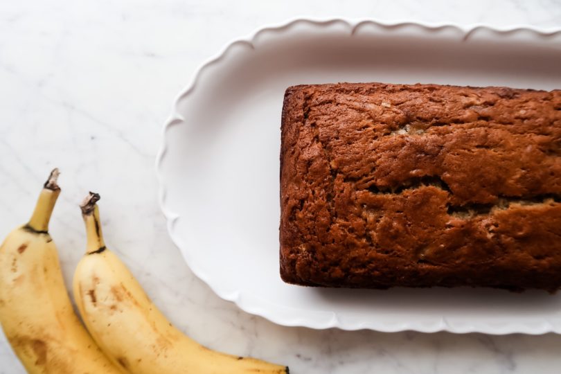 Well, well, well what do we have here. I mean, this is obviously not an outfit photo post but a recipe. On a fashion blog. But you know what? It’s a weird year anyway so why not share what I’ve been up to lately? I’ve been baking probably a lot lately like a lot of you. Or not. I don’t know your life. But if you have been baking or would like to, may I introduce you to the easiest banana bread recipe and the most delicious. It’s my mama’s recipe and let me tell you — it is comfort in a bread pan. It’s sweet but not too sweet, perfect with coffee and the little’s love it.