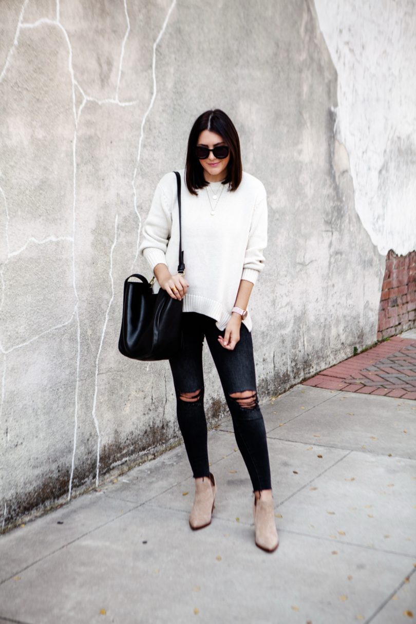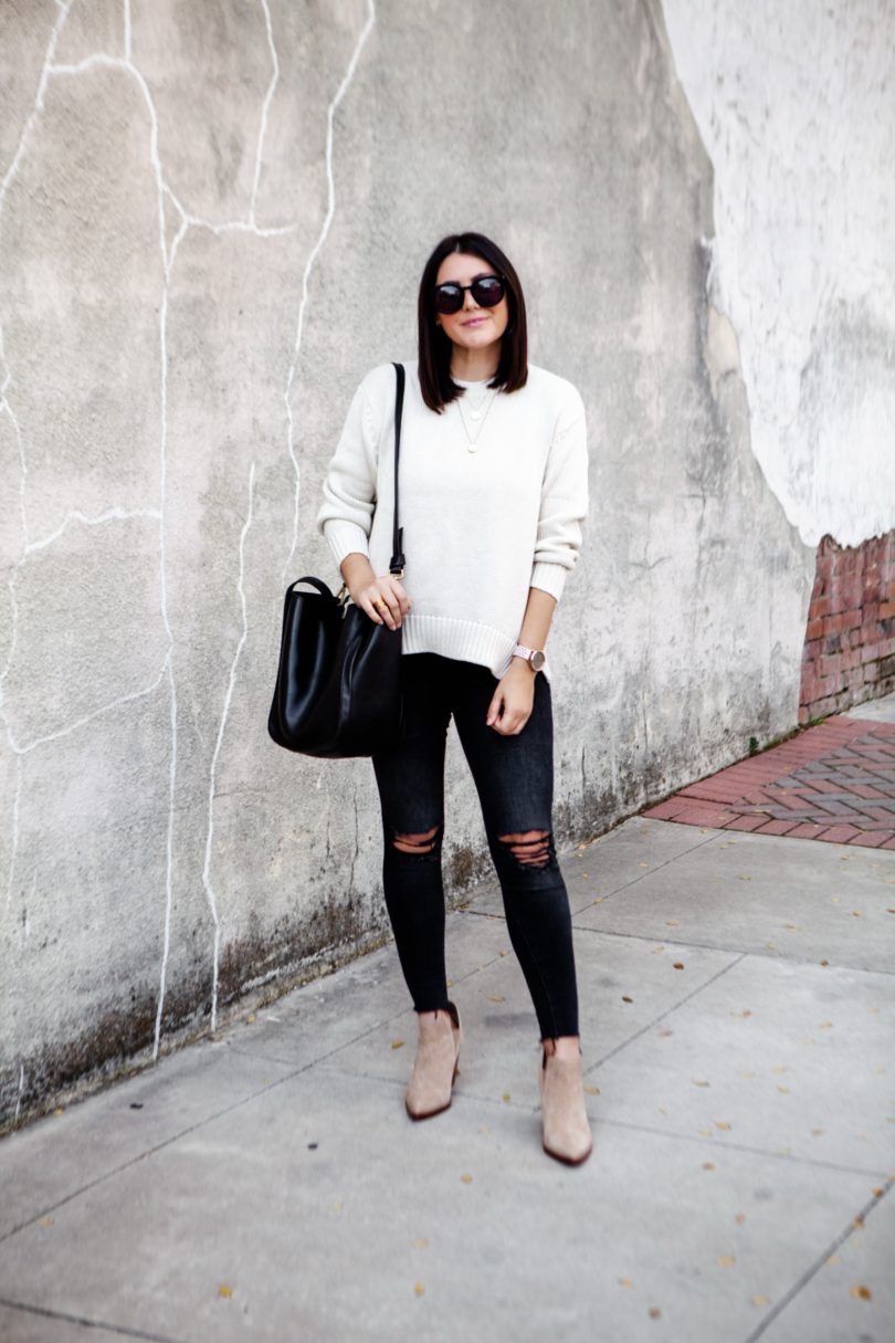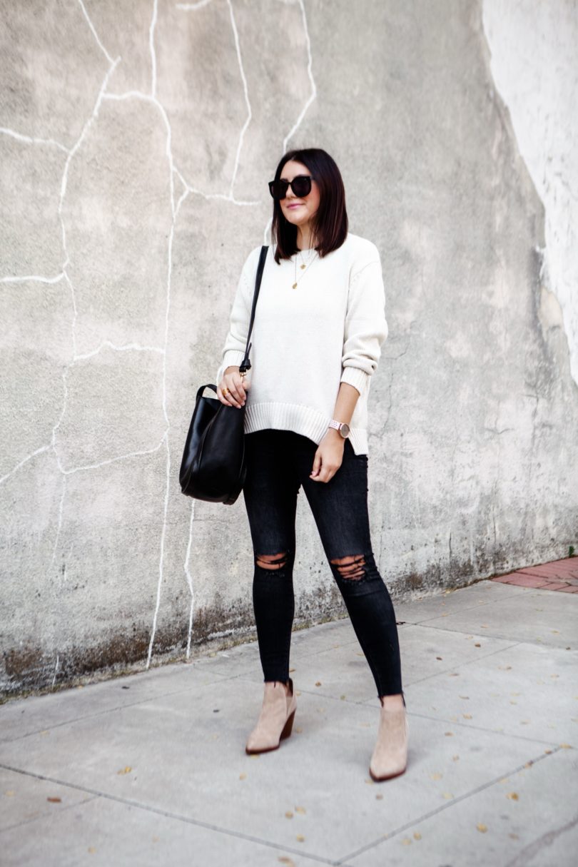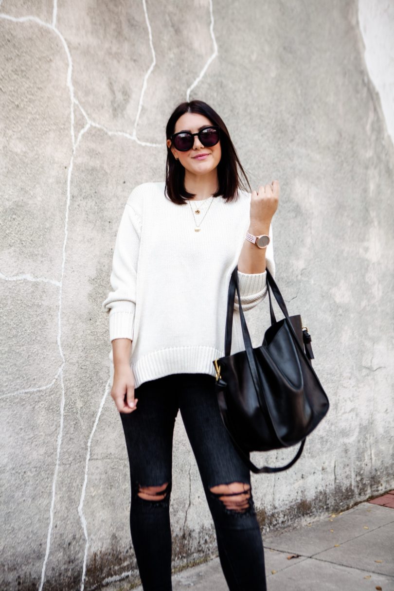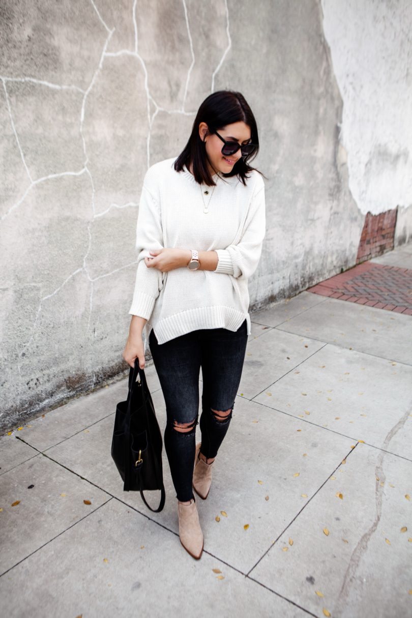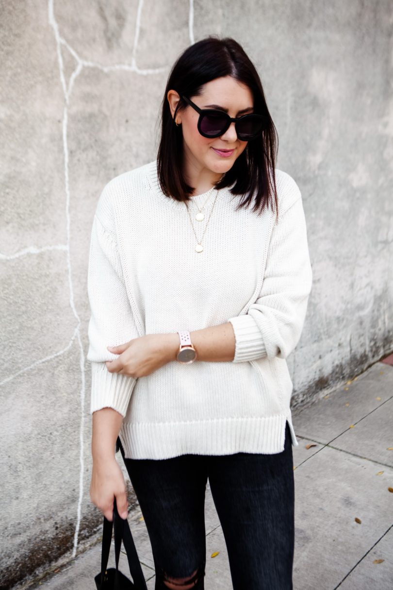 Can you believe that we are actually in sweater weather here in Texas? It comes and goes — some days still get warm mornings are downright chilly. I’ve been trying to get my steps in everyday (I’m trying to work up to my goal of 10k which is why you see my Garmin watch in all my posts now. I can’t waste these 50 steps during the photoshoots, lol.). So yesterday I went for an early morning walk and evening walk and this dummy only wore a tee shirt. I was FREEZING. So I don’t know who pulled the weather swapsies on Texas but I am here for it. I mean let’s be honest — I would have been wearing a sweater this month anyways. But now I don’t have to sweat through the pain 😉
