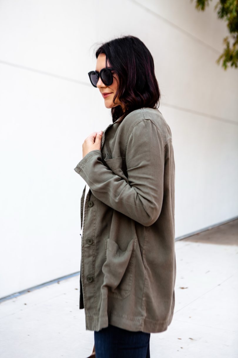 This outfit is actually perfect for right now, when it’s a bit cooler in the mornings and evenings but the days still hold warmth. I layered this fabulous v-neck sweater under this lightweight canvas jacket. First off, this sweater is everything. It’s loose in all the right places and fits in all the right places. I did size up because I wanted extra slouch — so you can stay true to size if you want it a bit less loose. (I’m in the large) It’s adorable with just denim and booties as well, a serious favorite! I feel like this one will sell out fast. Find this sweater here.
