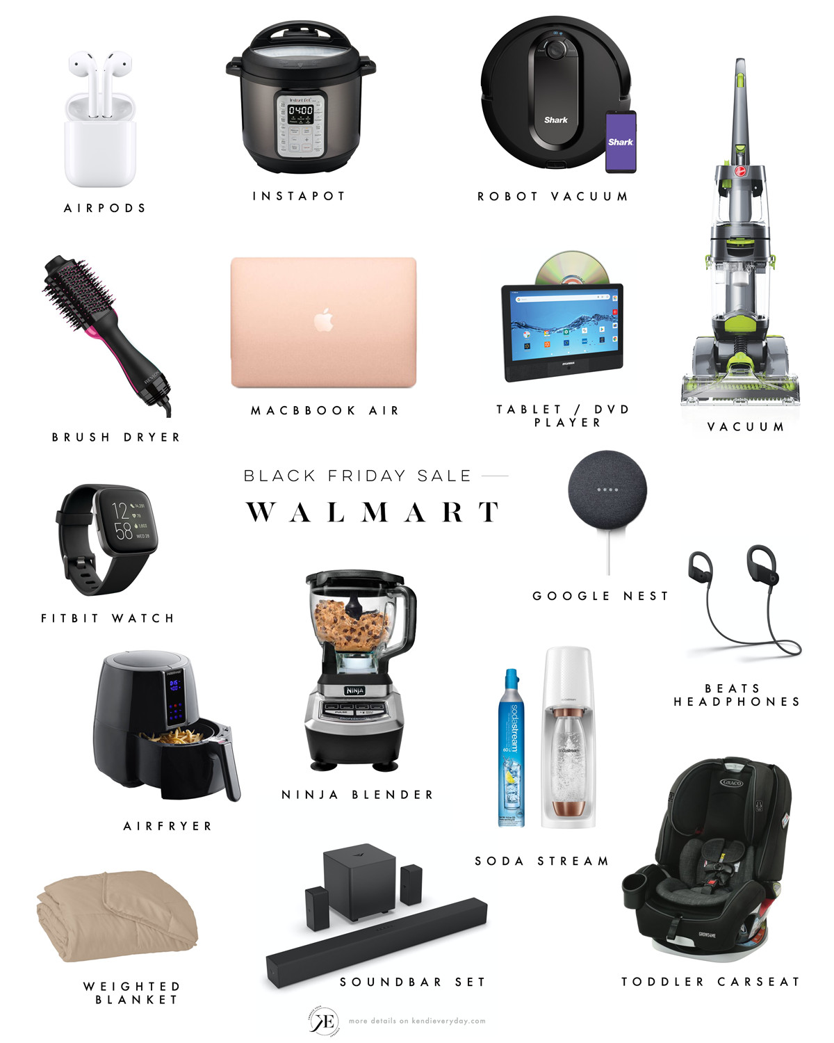 Apple AirPods / Instant Pot Viva / Shark IQ Robot Vacuum / Revlon Brush Dryer / Apple Macbook Air / Sylvania Tablet DVD Combo / Hoover Carpet Cleaner / Fitbit Versa Smartwatch / Google Nest Mini / Powerbeats Wireless Headphones / Farberware Air Fryer / Ninja Blender / SodaStream / Tranquility Weighted Blanket / Vizio Soundbar System