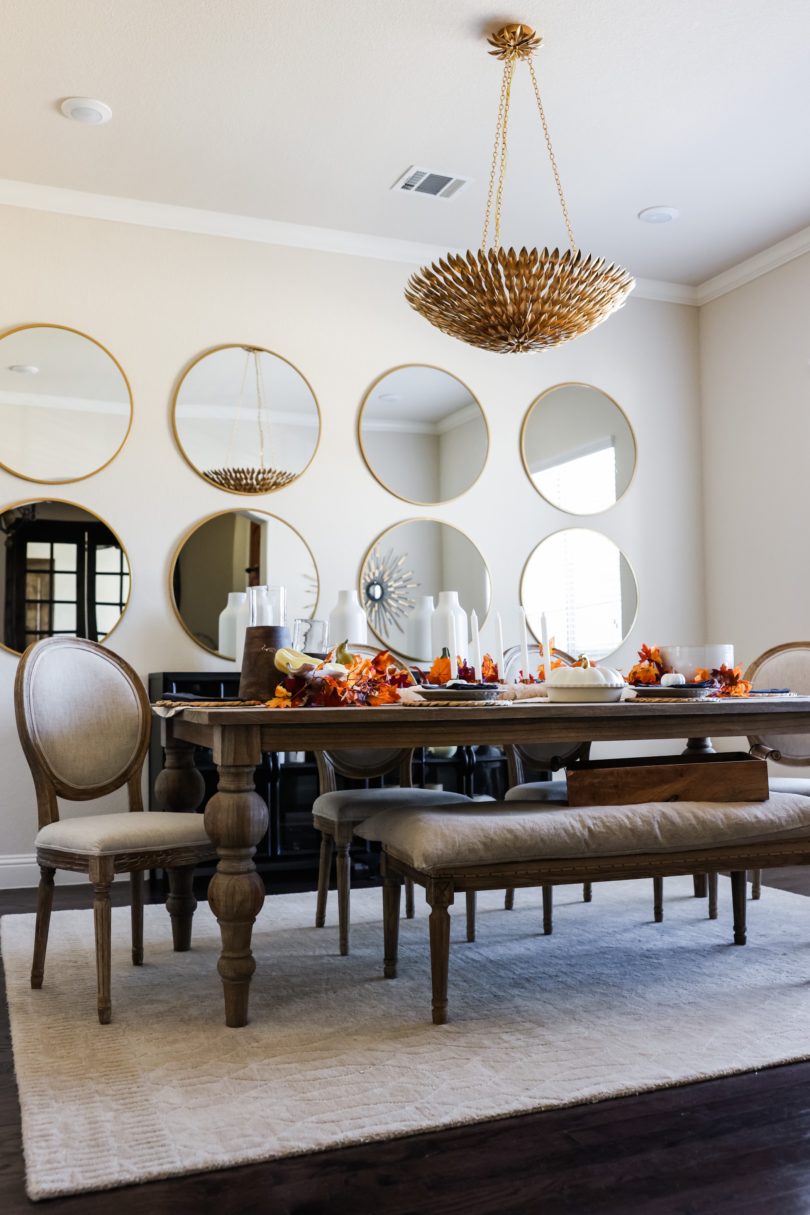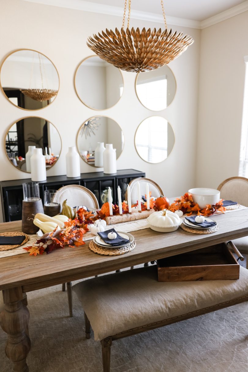 I wanted just a simple table-scape with some color since our house is pretty much all beige and grey. I took a chance on these leaves and you know what?! They’re not bad! They give wonderful pop of color and don’t look too cheap. It’s a garland and I’ll definitely keep it for next year. Find the leaf garland here.