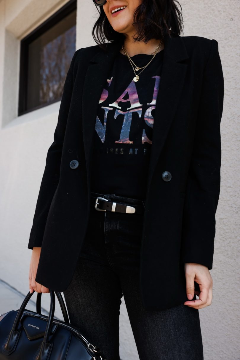 This year the graphic tee seems to be one bold image or statement with words only. It doesn’t even have to make sense — for example my tee is from the brand All Saints, so it spells out ‘SAINTS’ in an embroidered thread (which is what makes this tee so cool) so that all tracks so far. But then underneath ‘SAINTS’ it randomly says ‘sunglasses at night’. What a weird thing to put on a tee, but it’s 2021, baby and anything goes. I didn’t even read the words on this tee until I got it home, I just liked the tee itself. So just a word to the wise — make sure you read what your shirt says before buying it. 😉