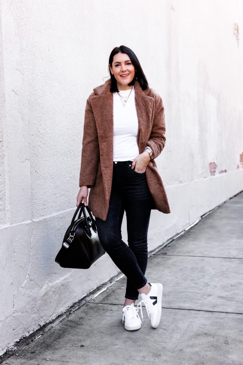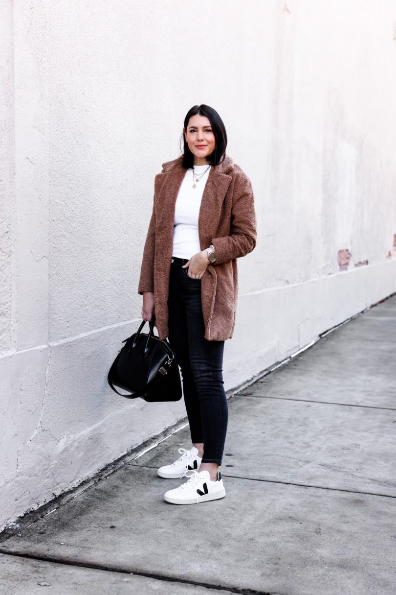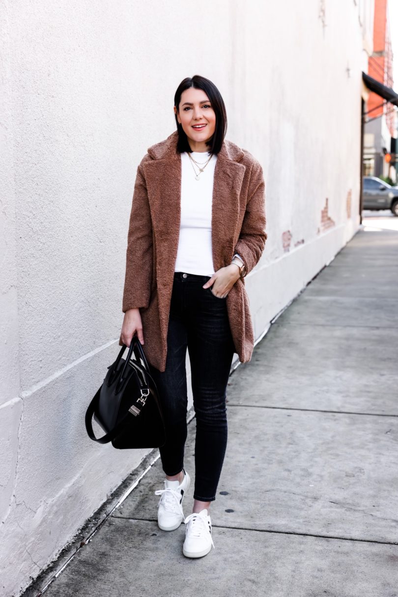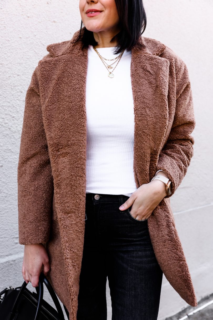 Enough about me, let’s talk about this coat! I am in the medium and it fits a bit big, so you could size down if you don’t need a lot of room for a bulky sweater. If you want room to layer, stay TTS. It’s lined and I love the feel of the teddy coat, it’s a tighter weave than most teddy coats, so it feels a bit more elevated. (Hopefully you can see that in the close up above!)
