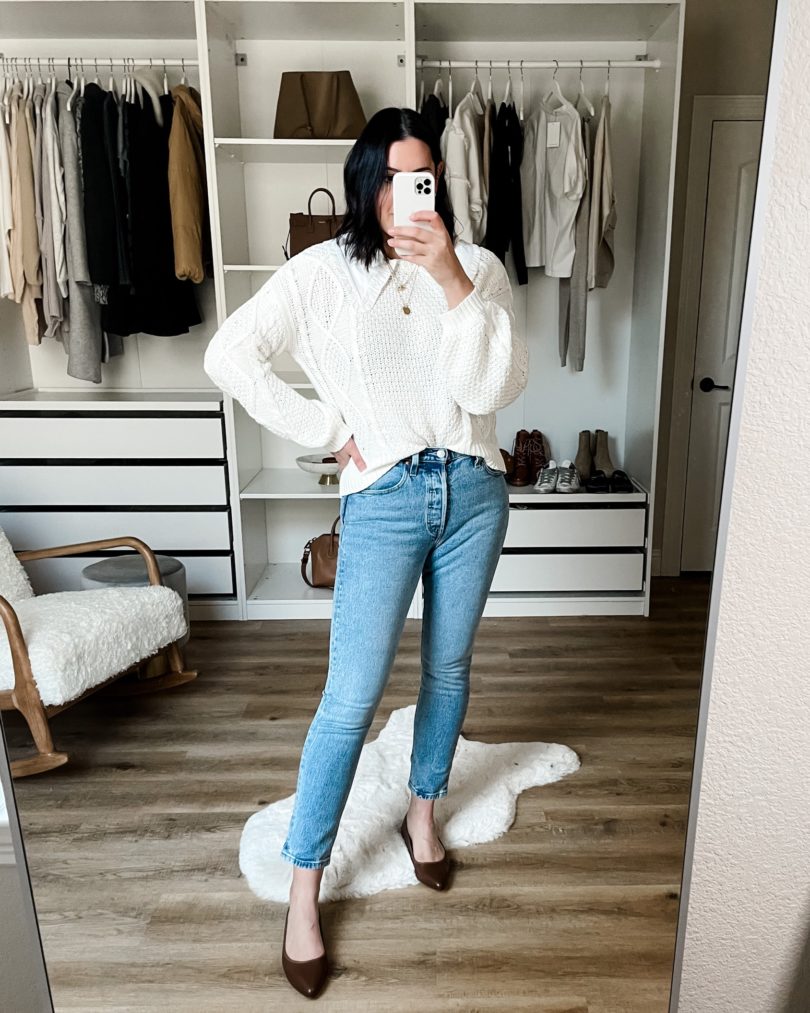 (Line and Dot Sweater/ Levi’s / Kahmune flats / Madewell necklaces)