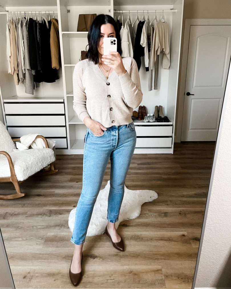 (Line and Dot Cardigan / Levi’s / Kahmune flats / Madewell necklaces)