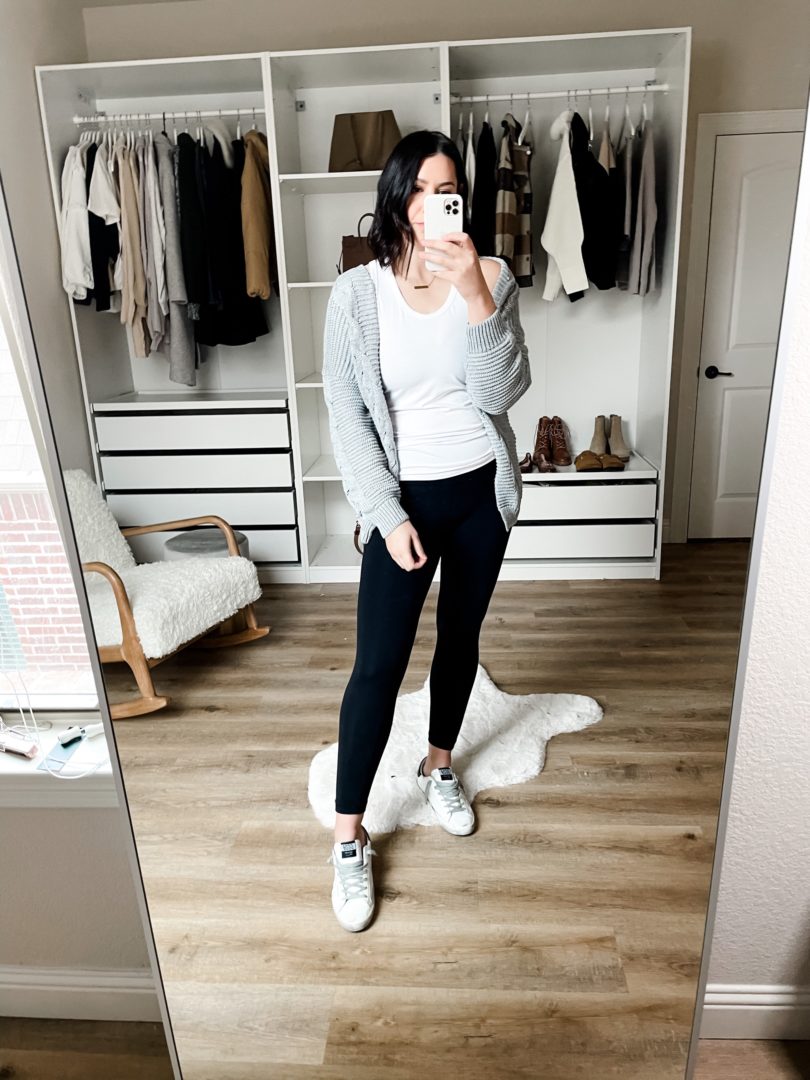 (Cardigan / Daily Ritutal Tank / Yogalicious Leggings / Golden Goose Sneakers)