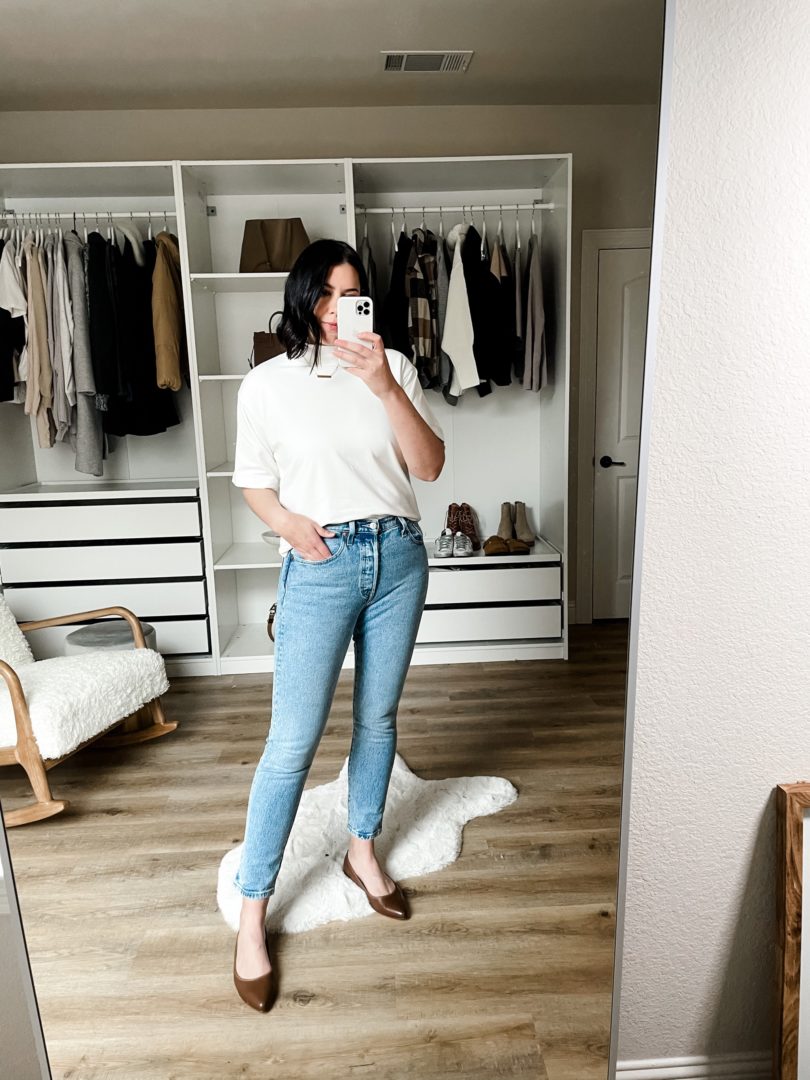 (Reformation Top / Levi’s / Kahmune flats / Madewell necklaces)