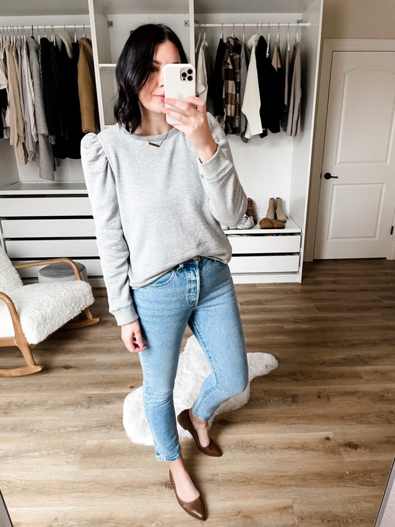 (Puff shoulder sweatshirt / Levi’s / Kahmune Flats)