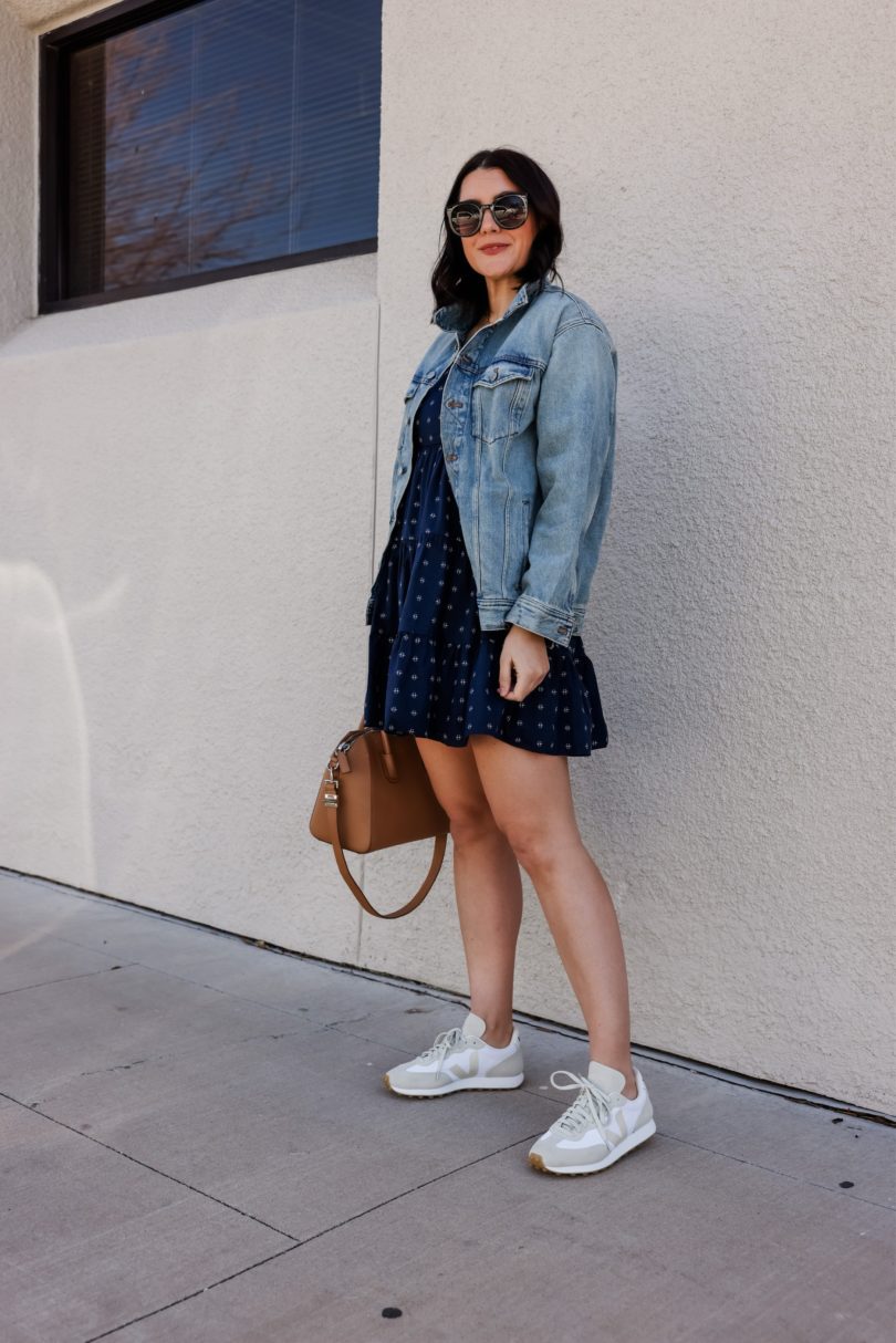 I found this dress at Madewell and scooped her right up. It fits perfectly (I’m in the 8) and it’s the perfect length for spring — kinda short, but also just right. I wanted to pair it with sneakers because that’s where I’m at right now and of course I like to toss on an extra layer in the spring. This oversized denim jacket is perfect for the causal look.