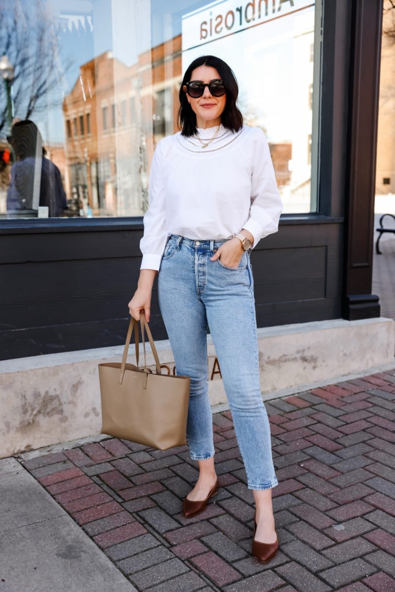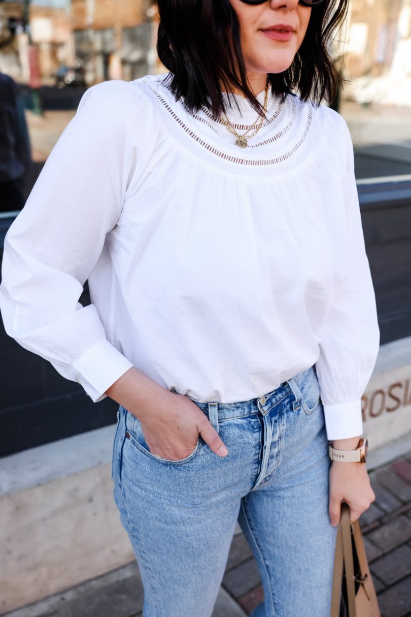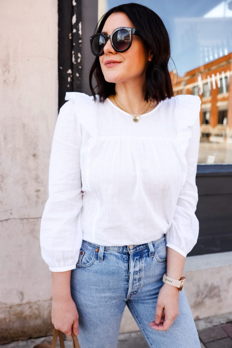 I am a firm believer in white for spring and while I do love a white jean, I really love a white blouse. In fact, I would say I *prefer* a white blouse or tee to white jeans just for the versatility. I have way too many outfit posts on here from past spring seasons that can back up my claims of white blouse love, but today I wanted to show you to in-season options that are perfect for this spring.