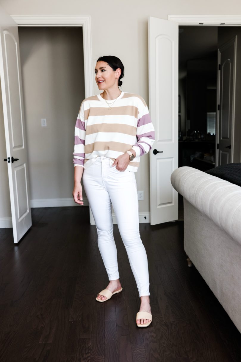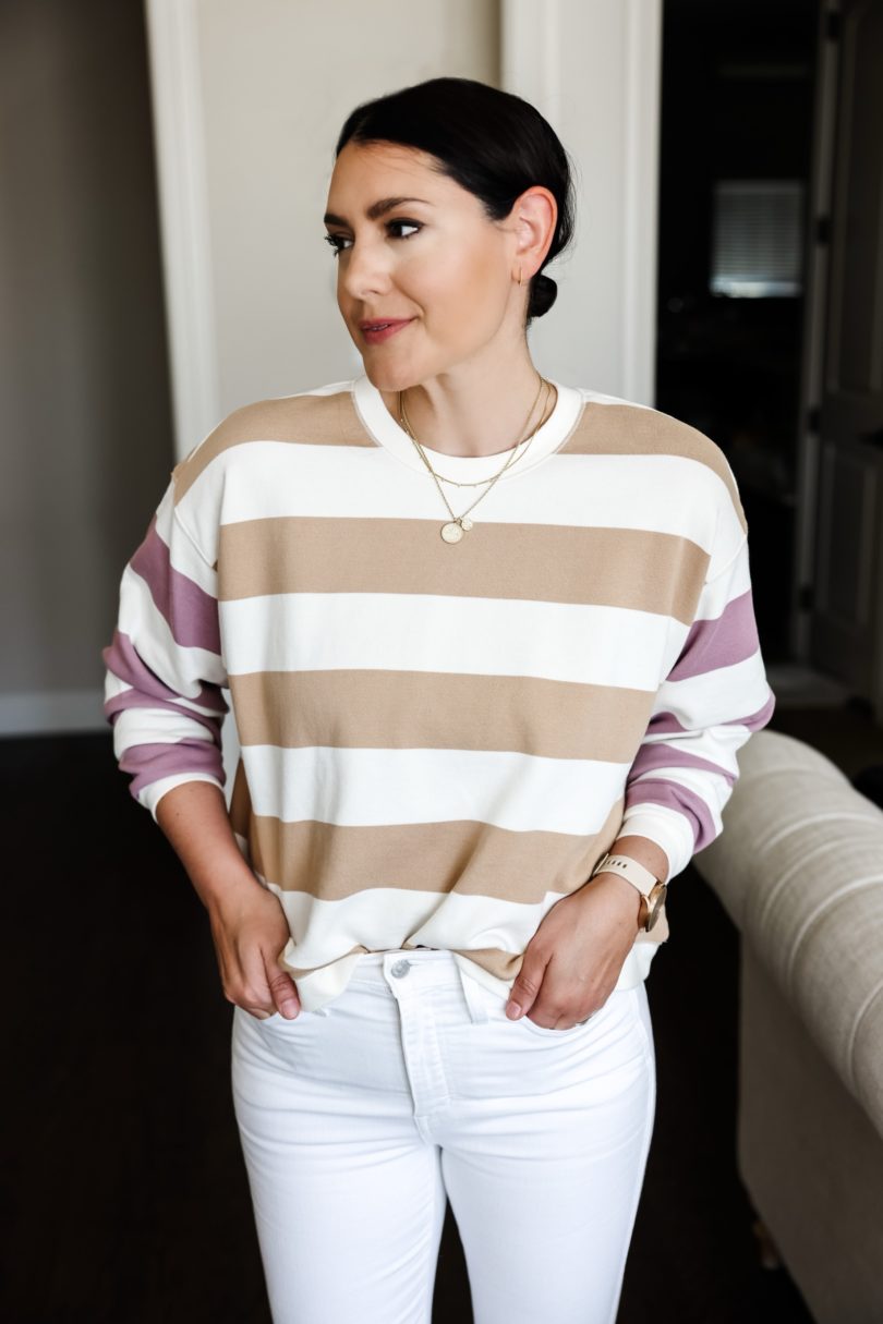 I love this striped sweatshirt from Madewell! At first I was like — is this too much color? Because you know, I’m trying to be super intentional with color lately. But after getting it in the mail and putting it on, I was sold. It’s big, soft and perfect weight for spring. Especially right now when the days can’t decide if they want to be warm or cold. And no, it’s not too much color. It’s just right. Also does this not feel very 1995? I feel like this sweatshirt has heavy 90s vibes and I kind of love it. Find it here!Â