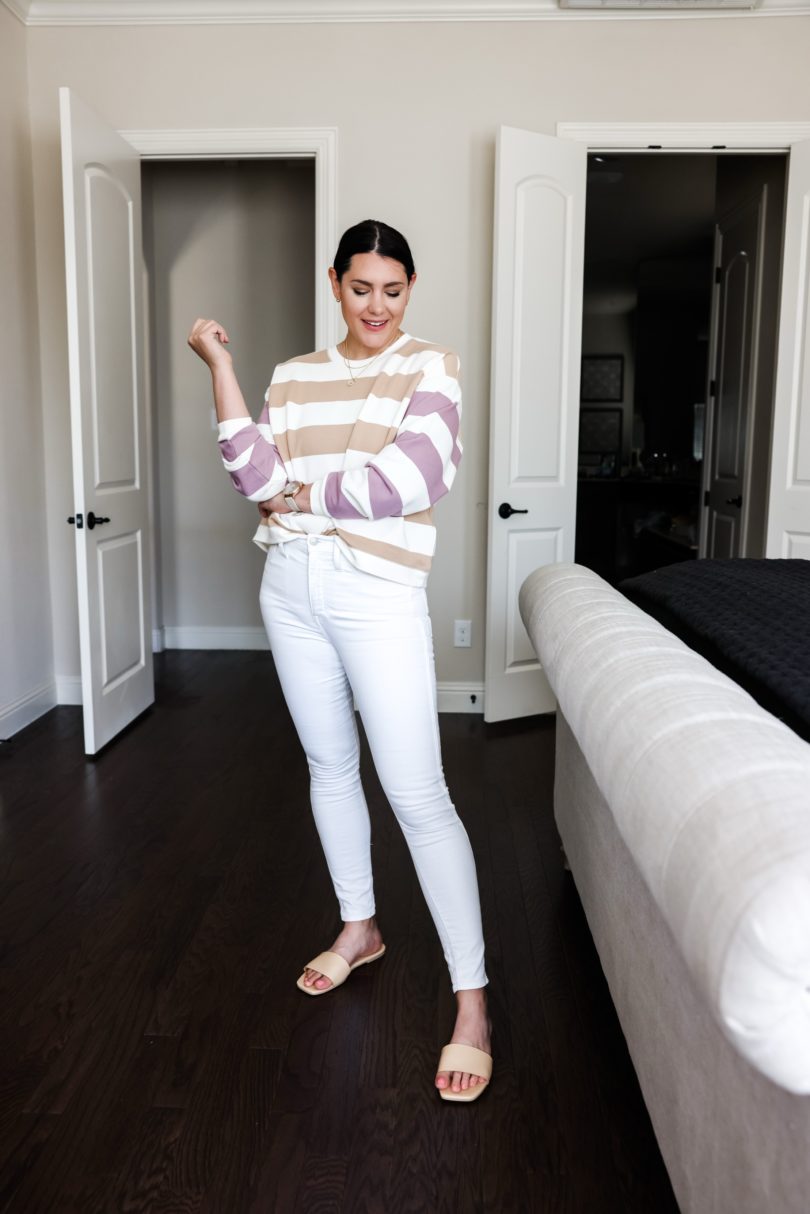 My white jeans are also from Madewell, surprise surprise right? I do like their white jeans and I do recommend these IF you a) like Madewell and b) prefer a high rise. They’re not sheer but they are pretty fitted. You know what I mean? Sometimes white jeans fit tighter than blue jeans and I would like to know why. The high rise is a 10″ and it means it. I would say true to size but they will be more fitted at first and will stretch with wear. Find them here!