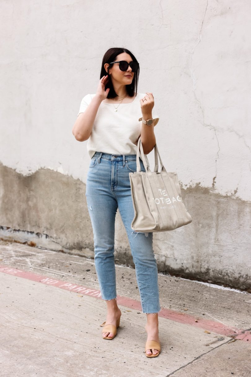 But first…about this top. This top is a jacquard fabric (so think a thick, textured feel but soft and comfortable) with a square neckline. I love the look and the texture gives the top an elevated feel, but it can also be worn just like a t-shirt. I am in the medium and after shooting it today, I do think it runs just a bit big on me. I could size down to a small but I’m in between sizes right now. I think it runs TTS but if you are smaller on top, or in between sizes, you could size down one.