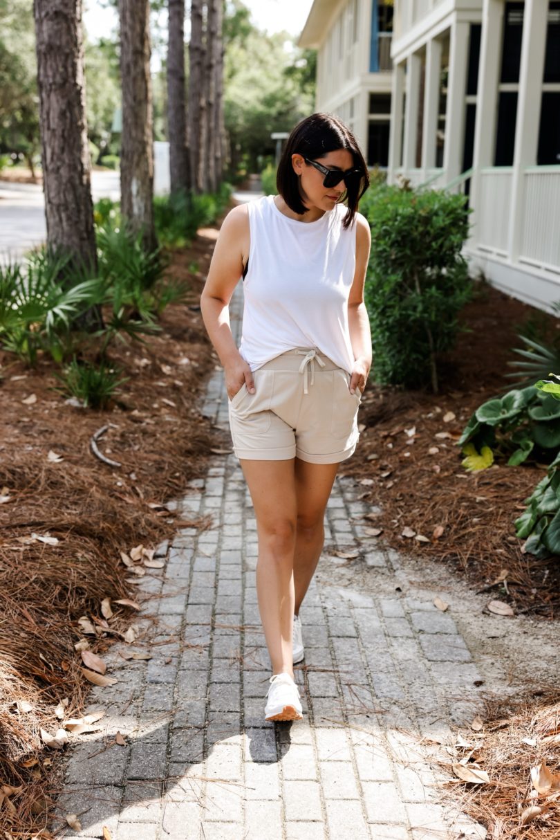 I feel like there are two types of people in the world — those who workout on vacation and those who don’t. Do you workout on vacation? You see, I thought that I would last week. I had really good intentions, you guys. I packed all of my workout gear, I double checked the gym on the map, I brought my water bottle. I mean I even remembered to pack my sports bra, which is truly the cornerstone of any workout. And… did I ever make it to the gym? No. No, I did not. But I did go for walks and we rode bikes and I hauled an almost 4 year old around with one arm most of the trip, so you know what? Maybe I did workout after all. I’m so glad I packed my workout attire anyways. Honestly I love packing athletic wear on vacation because it doubles as great travel wear and active wear. We would go for walks in the morning and I would toss on my favorite Zella shorts and my lightweight Zella tank top. These have to be some of my favorite shorts from Zella and for summer. They are soft, knit shorts (under $50!) that are a really nice length for working out but also just as a pair of casual shorts. It’s like if a jogger was a pair of shorts, it would be this pair here.