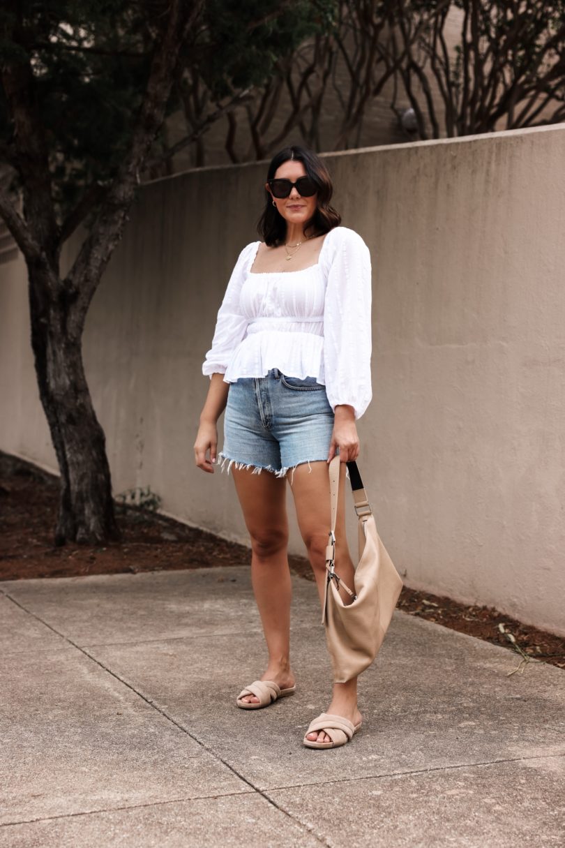 Some of us have been shopping at J.Crew lately and it shows. Two outfit posts in a row and possibly a third coming Monday? Just fair warning, it’s gonna be a Hot Mom Autumn featuring J.Crew, you guys. I’m telling you I was super surprised by their pre-fall in such a good way. As soon as I saw this top I knew it was the prefect pre-fall / late summer transition piece to wear with my beloved denim cut offs. Also it’s very Bridgerton inspired, if I do say so myself.