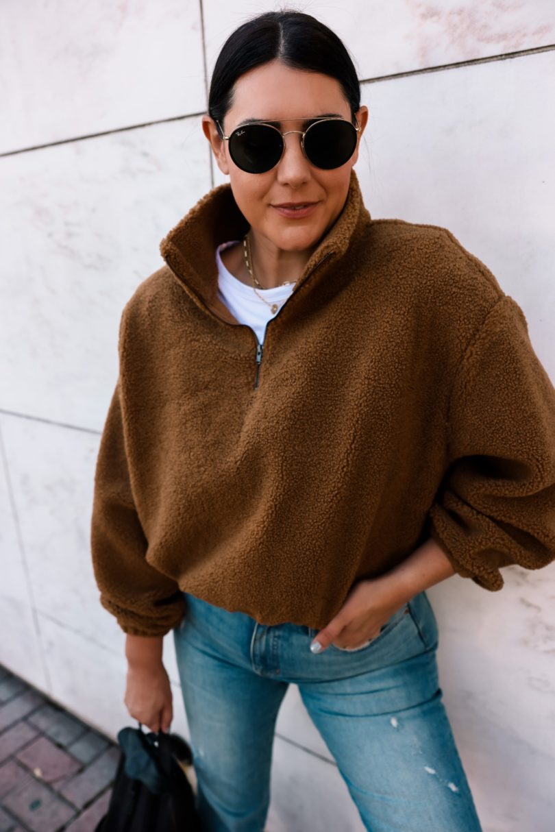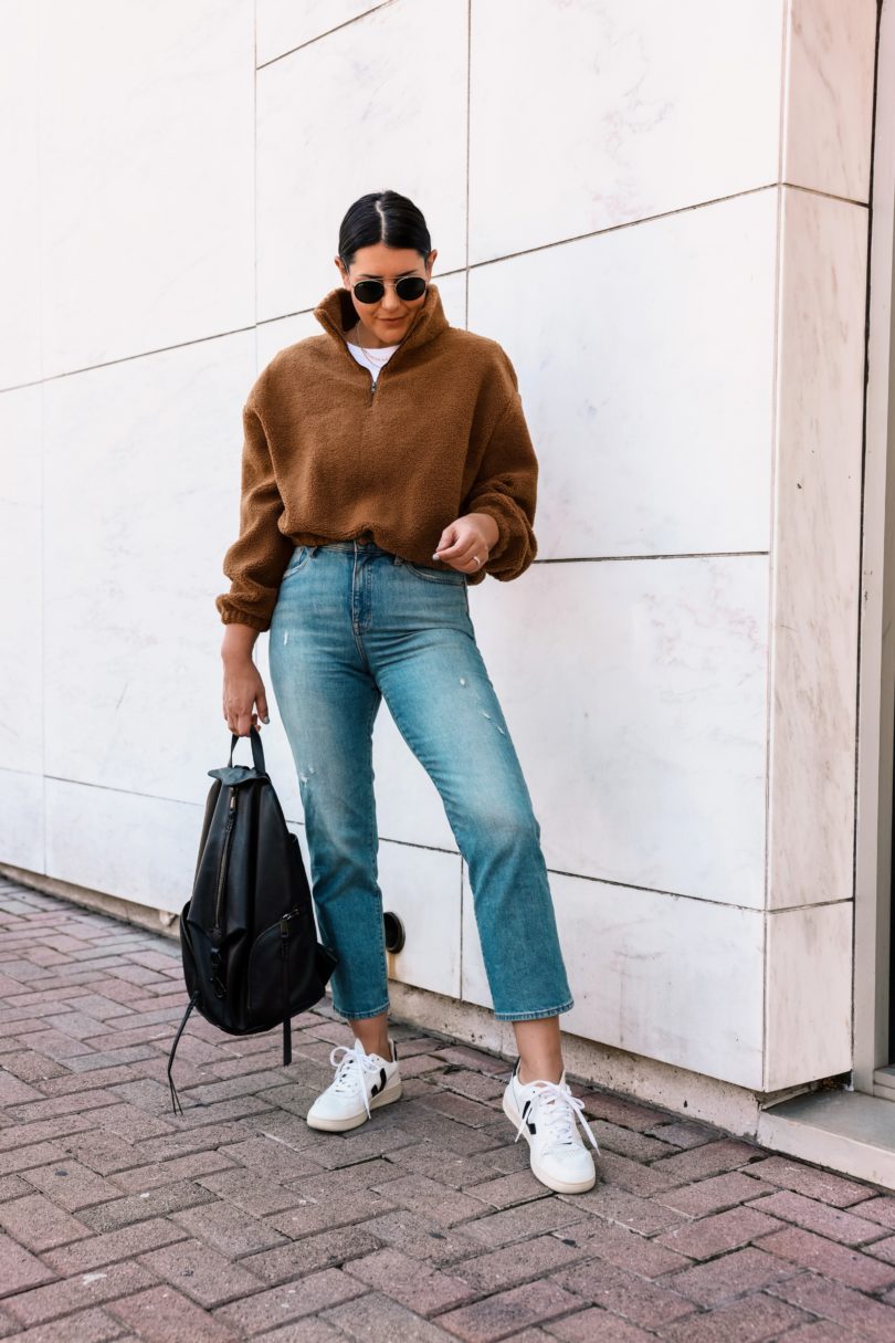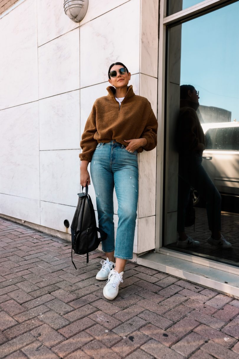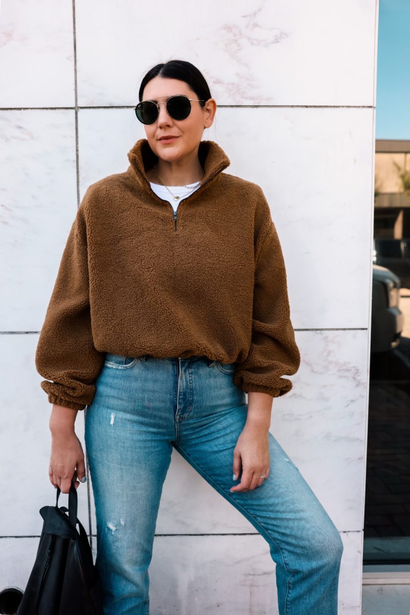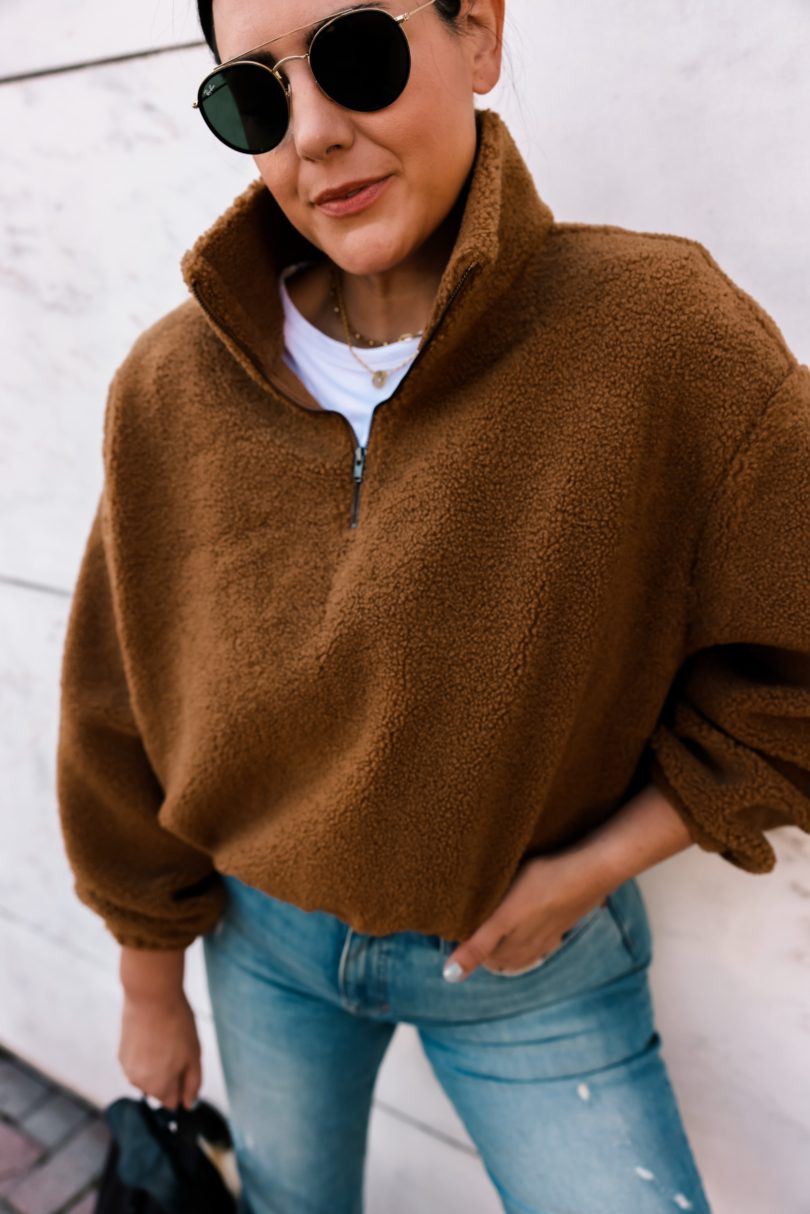 This pullover is from Reformation and I bought it when I found the Kendi dress for this month’s capsule. (okay, okay it’s not really named the ‘Kendi dress’ it’s just the color, but I’ve taken the liberty to make it about myself.) It does not disappoint. I wanted a high quality sherpa pullover this fall / winter because I tend to wear styles like this all the time. It’s almost like a jacket for me most days. It’s easy to layer over my workout gear or just denim and a tee. Plus it’s a bit warmer than a sweatshirt or hoodie. This one comes in two colors from Reformation and it fits TTS! I am in the medium.