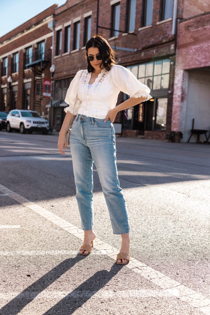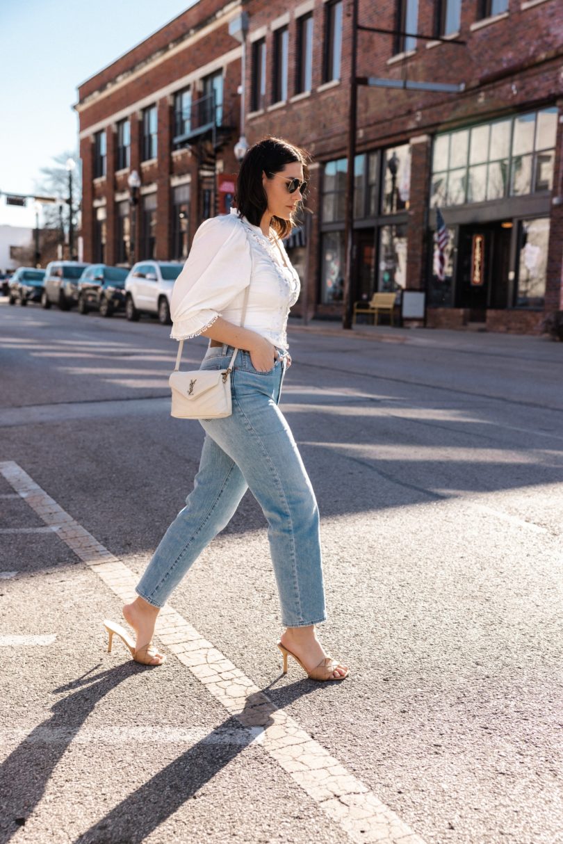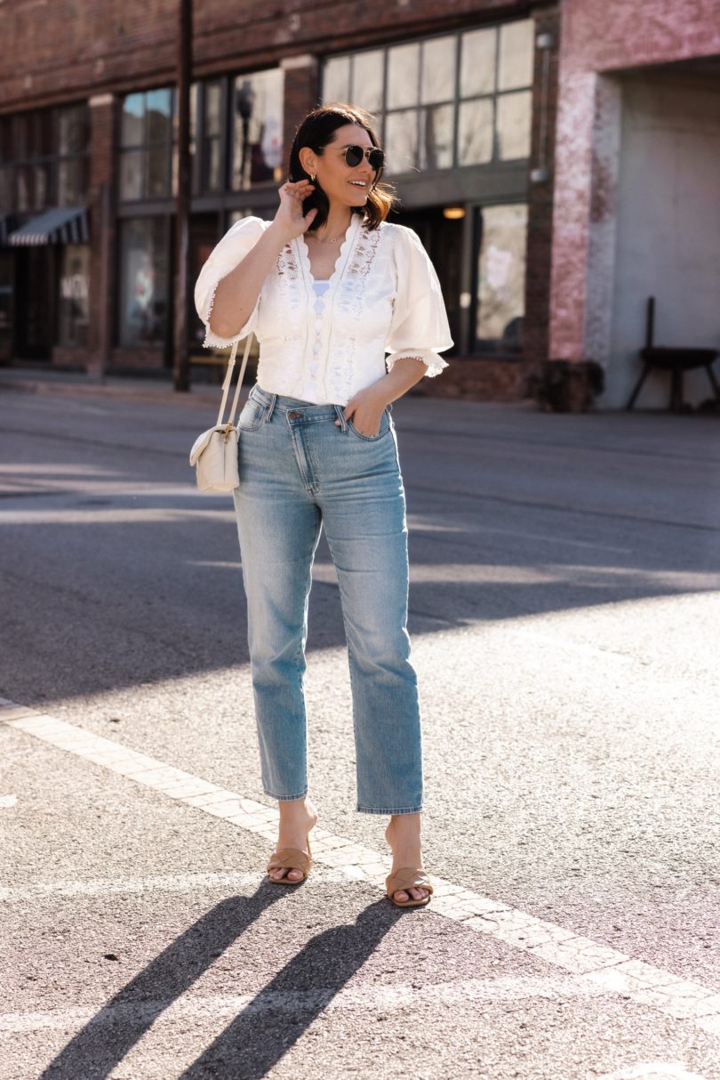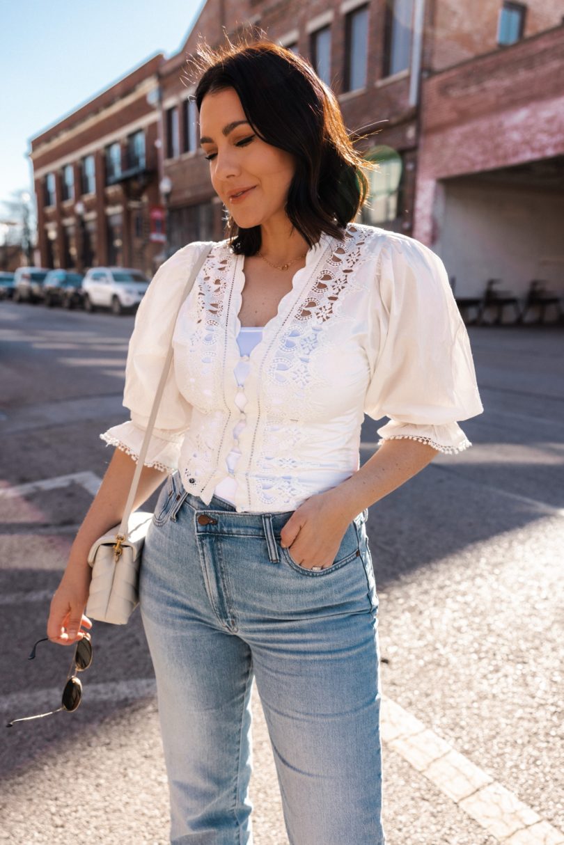 I fell in love with this top the second I saw it online. And then they added black and pink to it when I went back to buy it. I decided it’s the white one for me, as I love a classic white top for spring. This top is Free People, one of my very favorite brands for spring top and in fact, I’ve found 5 tops this spring that I’ve got my eye on, all from Nordstrom, all from Free People. In fact, my cart is busting at the proverbial seams because of all of their spring new arrivals. But I edited it down to just 5 tops under $130 for your sake. No one needs to know about the 50 items that are patiently waiting my cart.
