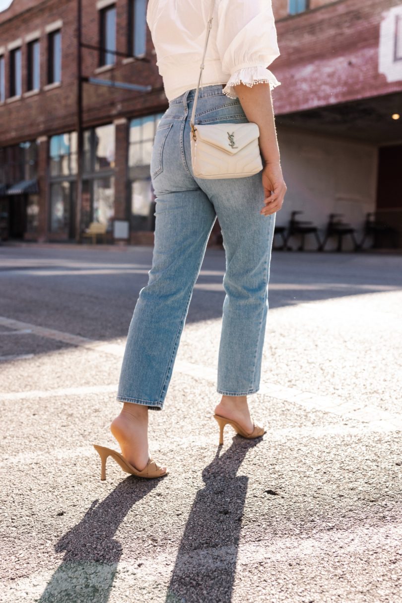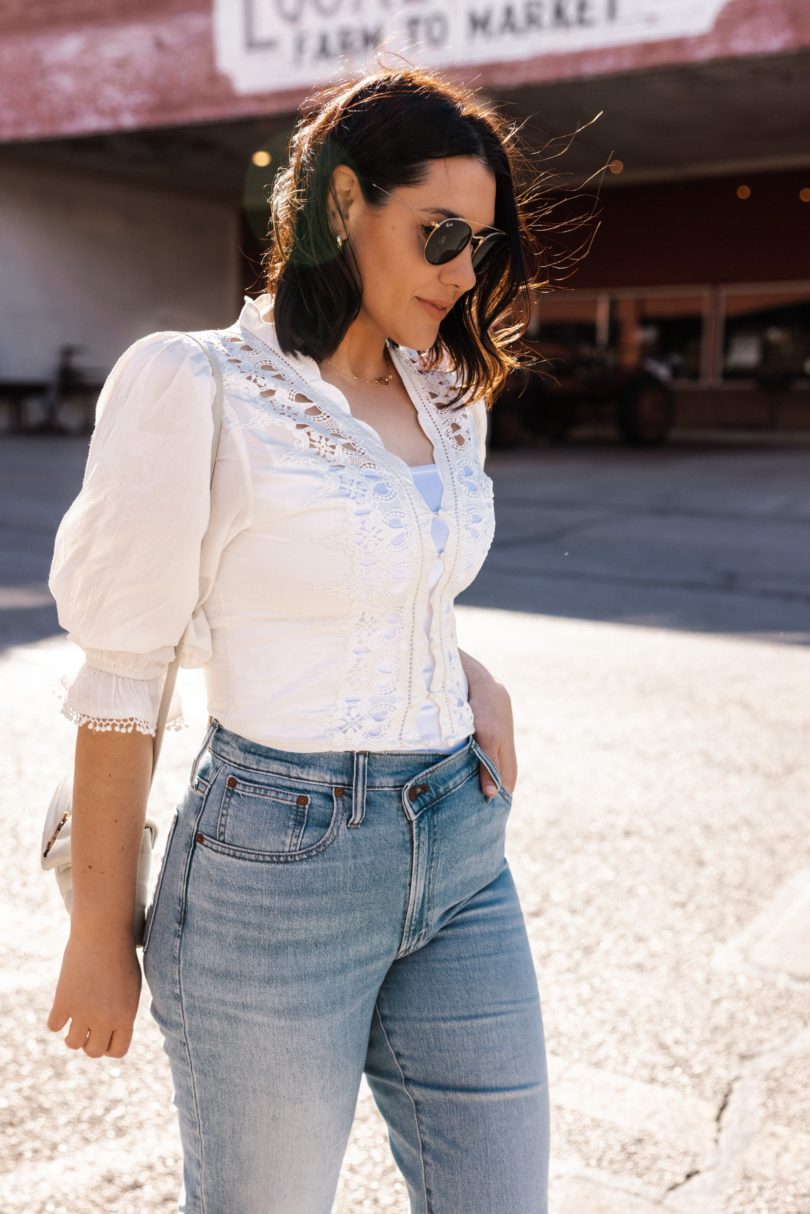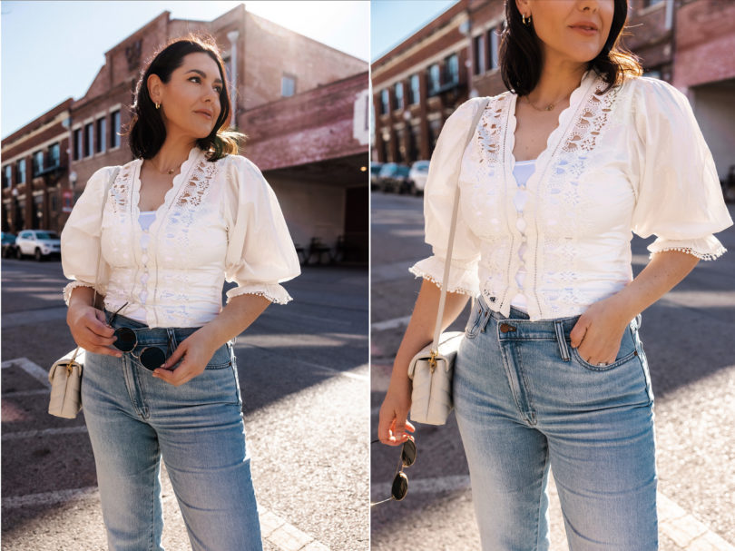 This top I’m wearing is the Free People Louella Top and I must tell you it runs snug. I think I may swap it for the large, as this is the medium and it is a pretty tight fit at my chest. Oh and do you see how the model is wearing it? If that look intimidates you or you just prefer to be covered a bit more (same) then have no fear, my dear because I paired mine with a camisole and it worked out perfectly. Honestly I kinda like it better. I went with a shelf bra camisole because of the tight chest situation, but you could easily just do a regular bodysuit or a regular camisole. I’ve linked two options to the side!