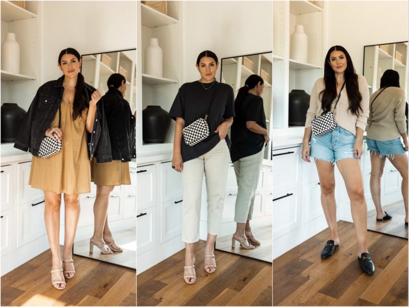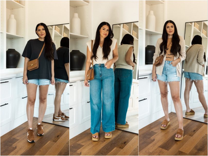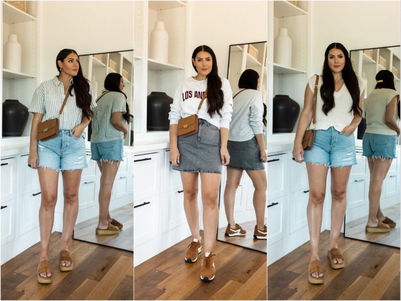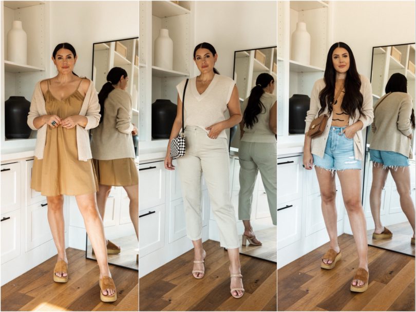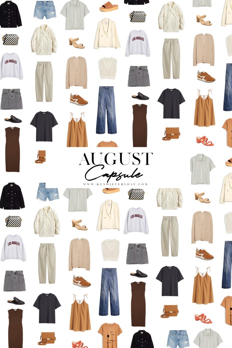 Happy August! August is always a month where a) I can’t believe summer is almost over and b) it’s a month where I literally don’t know what to wear anymore. Summer clothes aren’t popping like they did in May and it’s wayyyyy too early for fall. So for this capsule, I compromised. I added in a few layers that can work as it cools down (or for us who freeze in the a/c!) and I kept my summer must-haves like denim shorts, a couple of lightweight dresses, sandals and my favorite platform slides. I added in some transitional pieces like a dark denim jacket (spoiler I didn’t use it much!), items in shades of brown and my black loafers to give this capsule a nice not quite fall feel. Let’s get to the pieces!